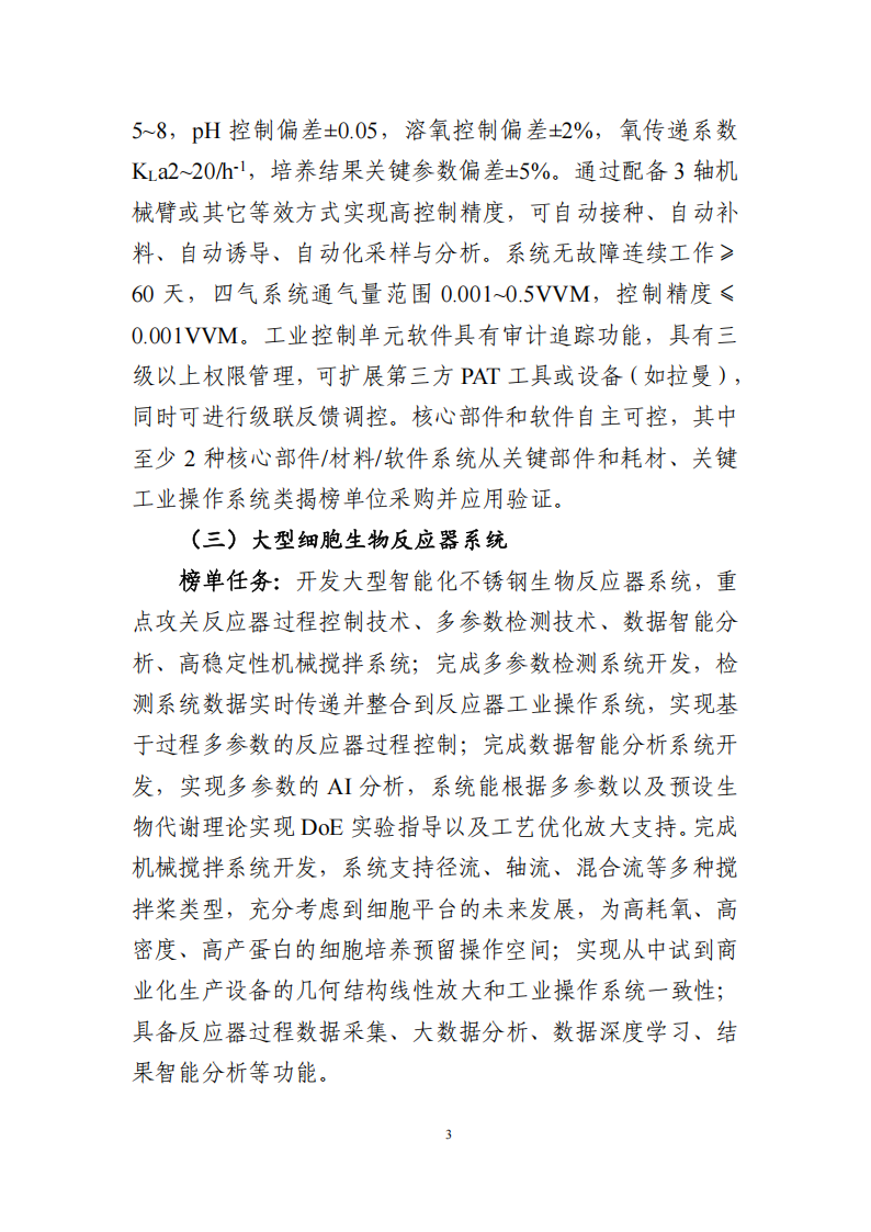 (二)申請要求。申請單位或聯合體應具有高性能生物反應器創新工作基礎和攻關能力,各項管理運行制度健全,近3年無重大安全和環境污染事故;已完成產業化前期驗證,具有基本定型產品且擁有知識產權;揭榜后能夠在各子任務榜單指定的期限內完成相關任務且達到預期目標。