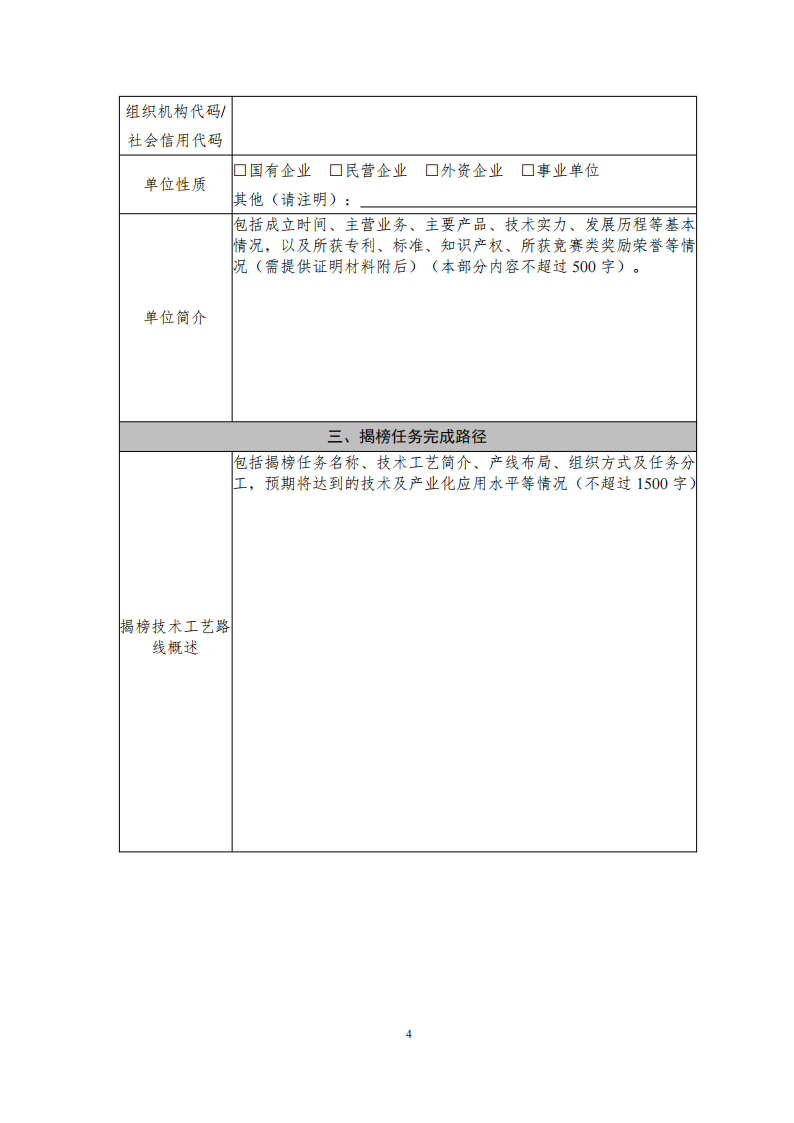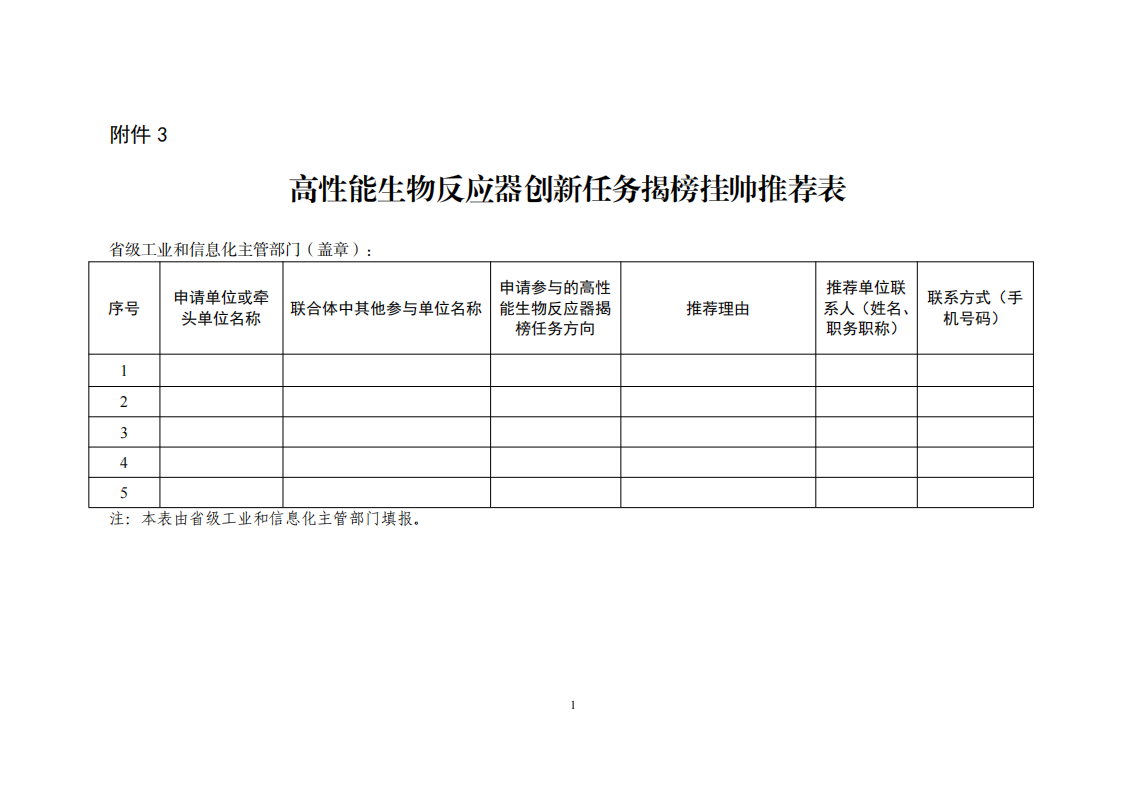 (一)提出申請。申請單位或聯合體牽頭單位按照本通知及《高性能生物反應器創新任務揭榜掛帥榜單》(附件1)要求,填寫《高性能生物反應器創新任務揭榜掛帥申請材料》(附件2),于2025年6月30日前提交至所在地省級工業和信息化主管部門。聯合體牽頭單位應將所有參與單位情況匯總后統一填寫并提交。