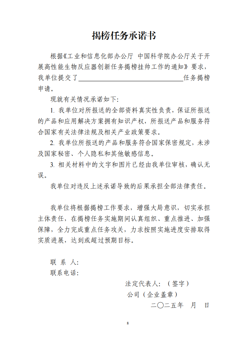 (二)省級推薦。各省級工業和信息化主管部門按本通知要求對申請材料真實性、完整性、有效性進行核實,可視情況組織專家開展研究論證,填寫《高性能生物反應器創新任務揭榜掛帥推薦表》(附件3),隨附相關申請材料及佐證材料,于2025年7月15日前向工業和信息化部(消費品工業司)推薦,電子版材料發送至郵箱(spc@miit.gov.cn)。