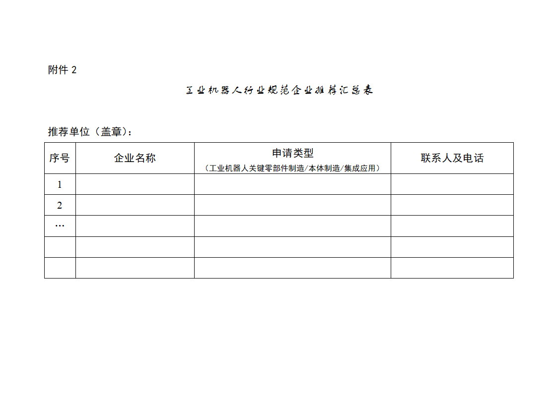 四、省級工業和信息化主管部門、中央企業將經初審符合《規范條件》的企業申請材料和推薦匯總表(附件2)(一式兩份),連同上一年度《工業機器人行業規范企業年度自查自評報告》,于2025年7月10日前報送至工業和信息化部裝備工業一司(北京市西城區西長安街13號),相關材料電子版(PDF)刻錄光盤隨紙質材料寄送。