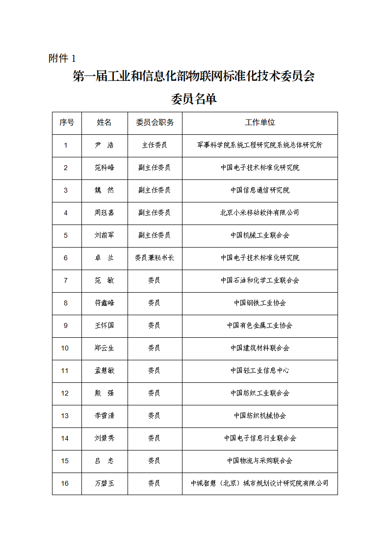 附件:1.第一屆工業和信息化部物聯網標準化技術委員會委員名單