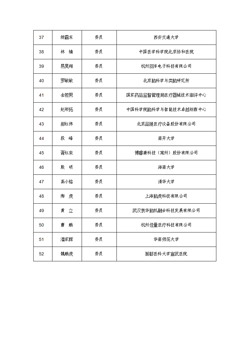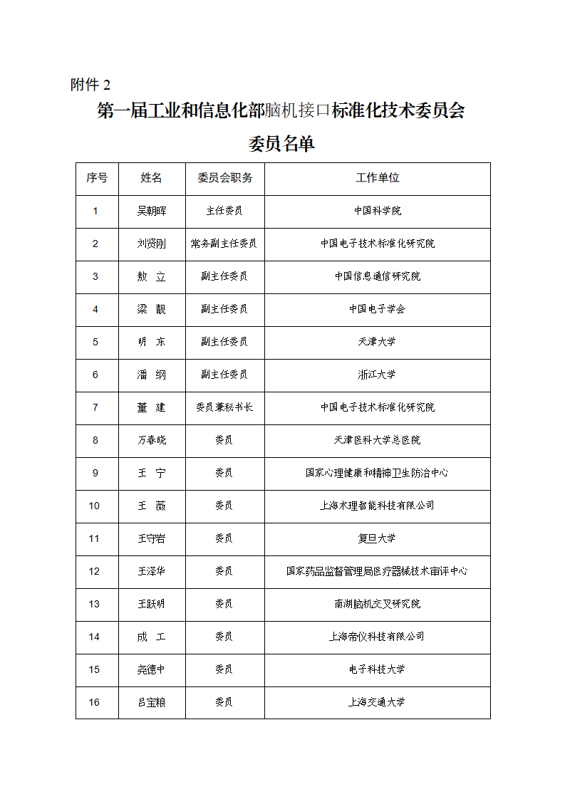 工業和信息化部腦機接口標準化技術委員會,編號為MIIT/TC4,主要負責腦機接口基礎共性、輸入輸出接口、數據、行業應用、倫理安全等領域行業標準制修訂工作。第一屆工業和信息化部腦機接口標準化技術委員會由52名委員組成(見附件2),秘書處由中國電子技術標準化研究院承擔。