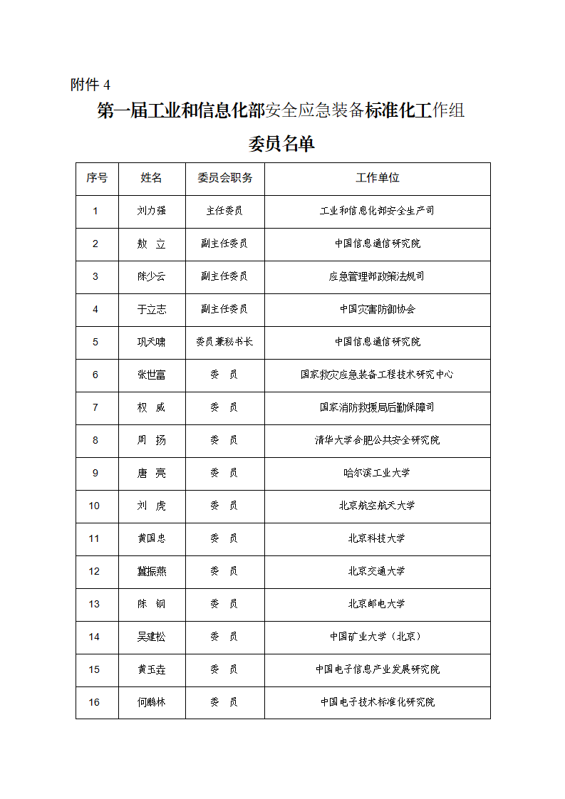 工業和信息化部安全應急裝備標準化工作組,編號為MIIT/SWG1,主要負責安全應急裝備基礎通用、信息技術應用、智能裝備和管理服務等領域行業標準制修訂工作。第一屆工業和信息化部安全應急裝備標準化工作組由75名委員組成(見附件4),秘書處由中國信息通信研究院承擔。