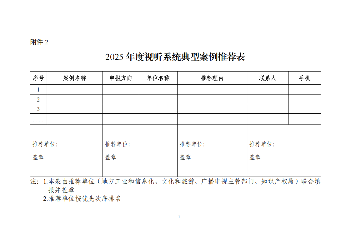 (四)各地工業和信息化主管部門會同同級文化和旅游主管部門、廣播電視主管部門、知識產權局對申報材料進行審核,確定擬推薦案例名單,并出具聯合蓋章的《2025年度視聽系統典型案例推薦表》(附件2),由各地工業和信息化主管部門報送。中央企業要做好子企業申報材料的審核工作,出具《2025年度視聽系統典型案例推薦表》并報送。各地工業和信息化主管部門、中央企業于7月18日前將紙質版《2025年度視聽系統典型案例申報書》和《2025年度視聽系統典型案例推薦表》一式三份寄送至中國電子信息產業發展研究院(北京市海淀區萬壽路27號院8號樓12層,胡恩龍),同時將電子版材料(申報書、推薦表掃描件和可編輯版)發送至郵箱chenzhao@miit.gov.cn。