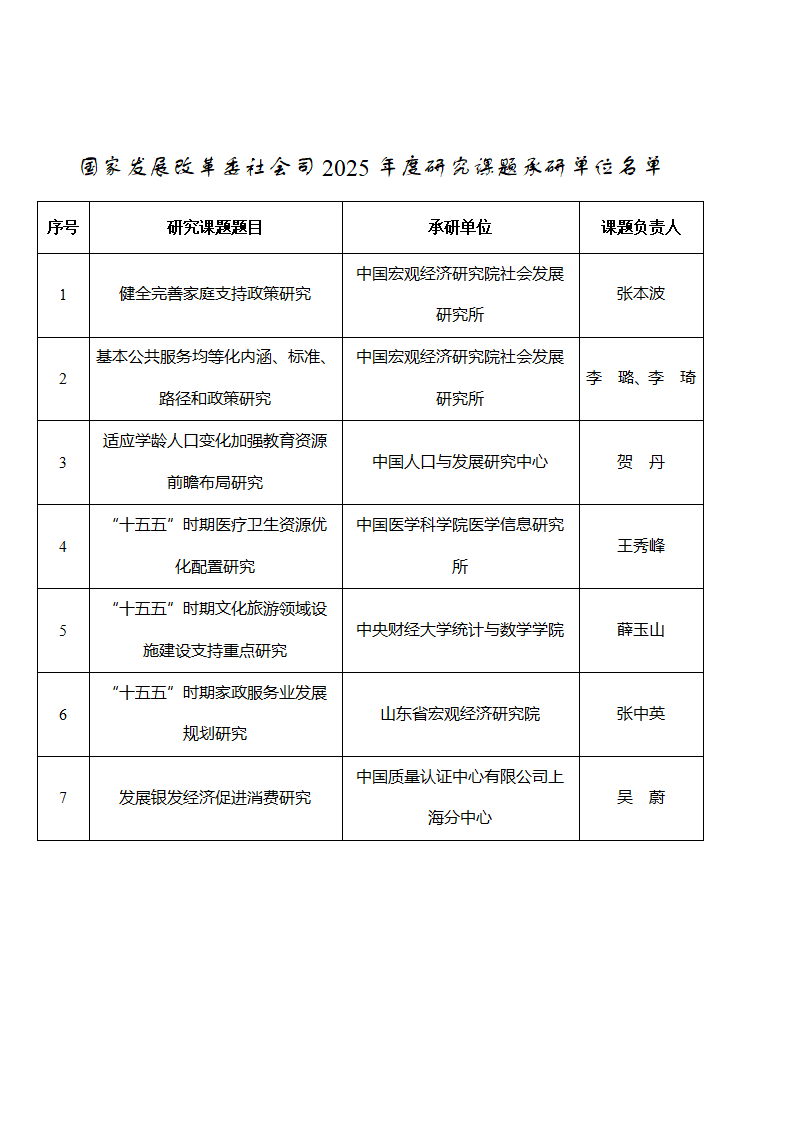 ? ? ? ? 2025年6月17日,我司在國家發展改革委門戶網站上發布了《國家發展改革委社會司2025年度研究課題征集公告》,截至6月27日申報結束共收到研究課題申報材料138份。經認真遴選,確定了7項課題承研單位(名單附后),現予公告。
