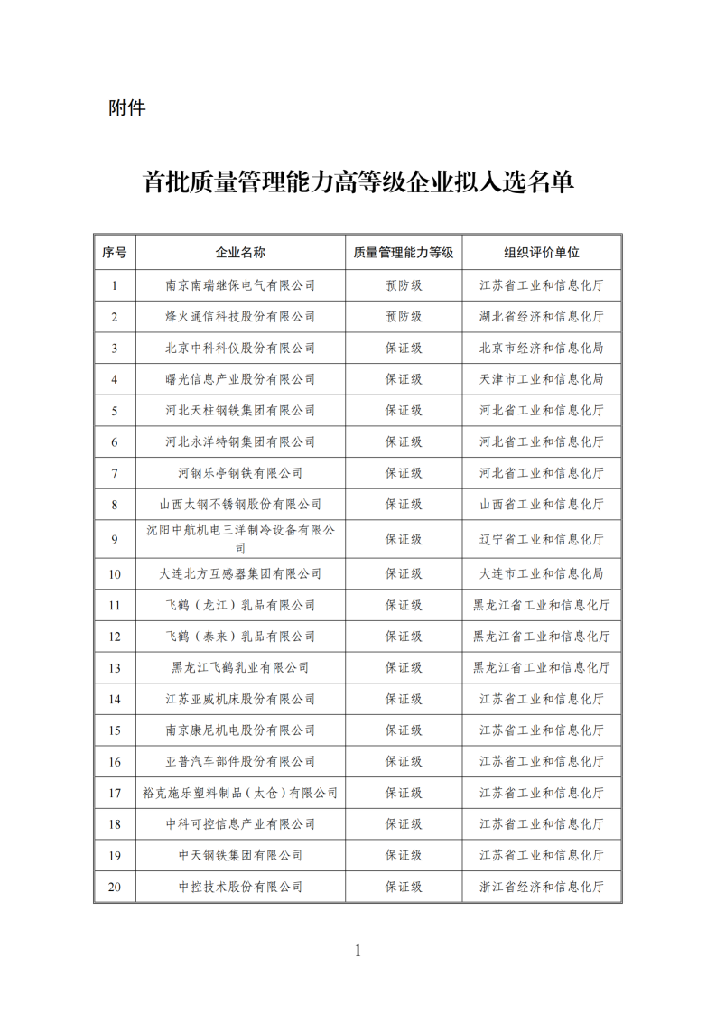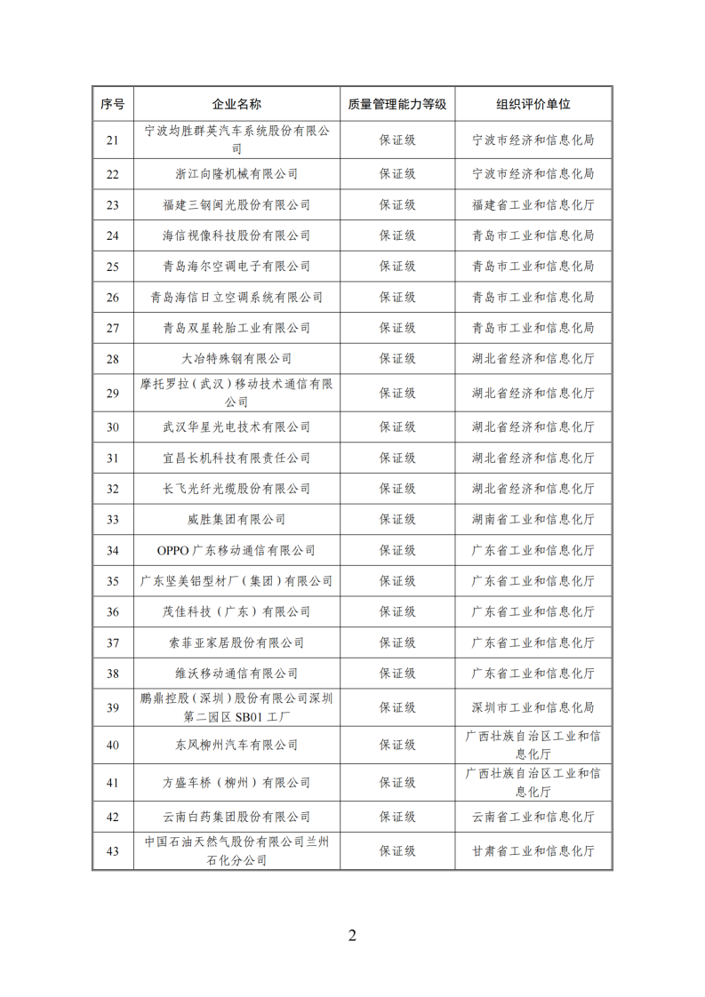 2024年,我們深入貫徹《制造業卓越質量工程實施意見》,以《制造業企業質量管理能力評估規范》行業標準為依據,組織開展制造業企業質量管理能力評價工作。為加強社會監督,現將首批43家評價復核結果達到保證級及以上高等級企業名單(見附件)予以公示。如有異議,請在公示期內將意見反饋至工業和信息化部科技司。