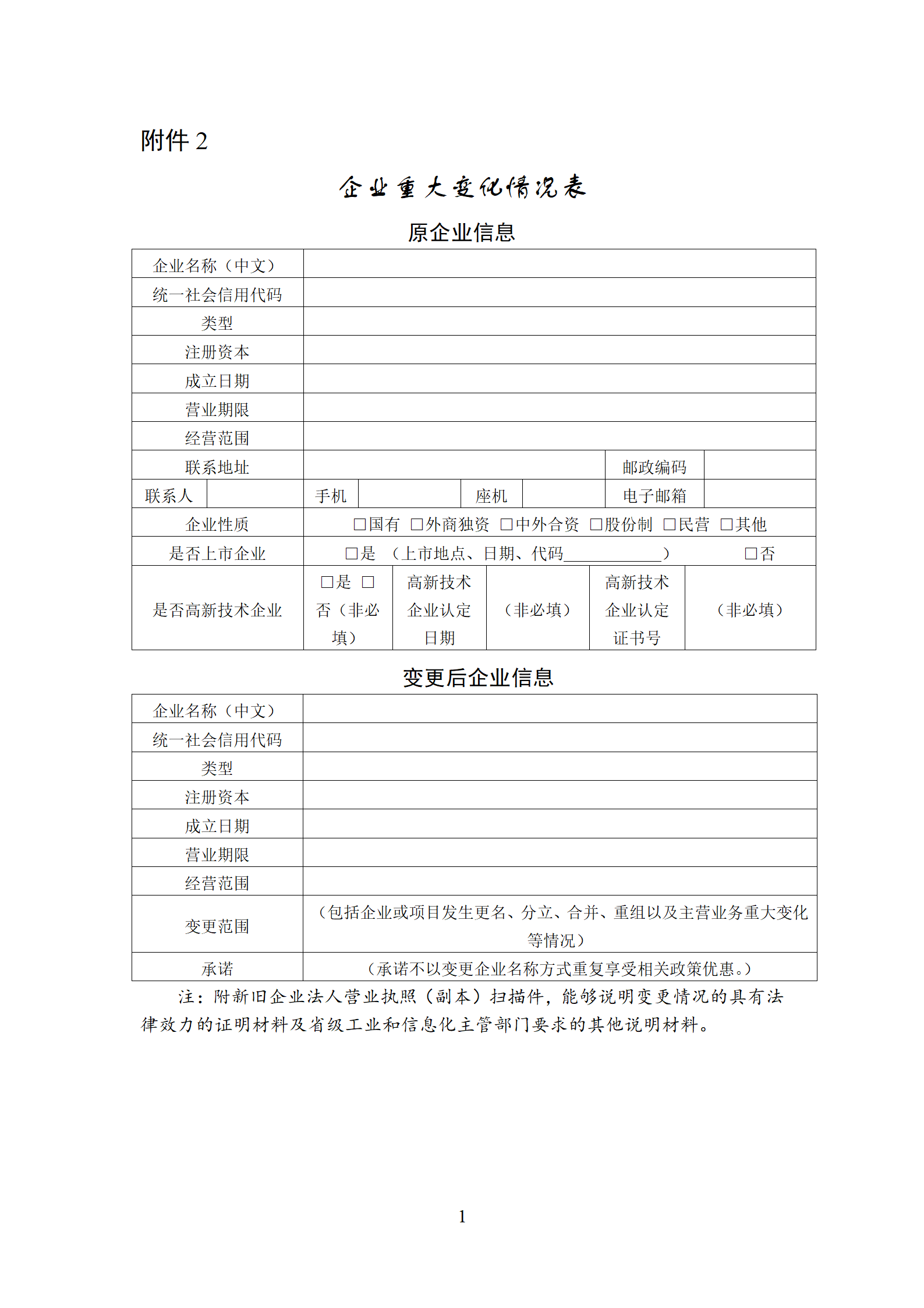 六、清單有效期內,如企業發生更名、分立、合并、重組以及主營業務重大變化等情況,應于完成變更登記之日起45日內向地方工信部門報告,地方工信部門于企業完成變更登記之日起60日內,將核實后的企業重大變化情況表(附件2)和相關材料報送工業和信息化部,工業和信息化部會同相關部門確定發生變更情形后是否繼續符合享受優惠政策的企業條件。企業超過本條前述時間報送變更情況說明的,地方工信部門不予受理,該企業自變更登記之日起停止享受2025年度相關政策。