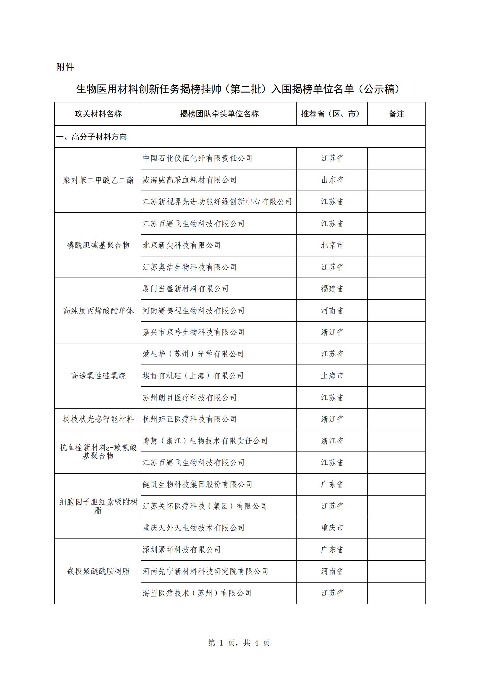 附件:生物醫用材料創新任務揭榜掛帥(第二批)入圍揭榜單位名單(公示稿)