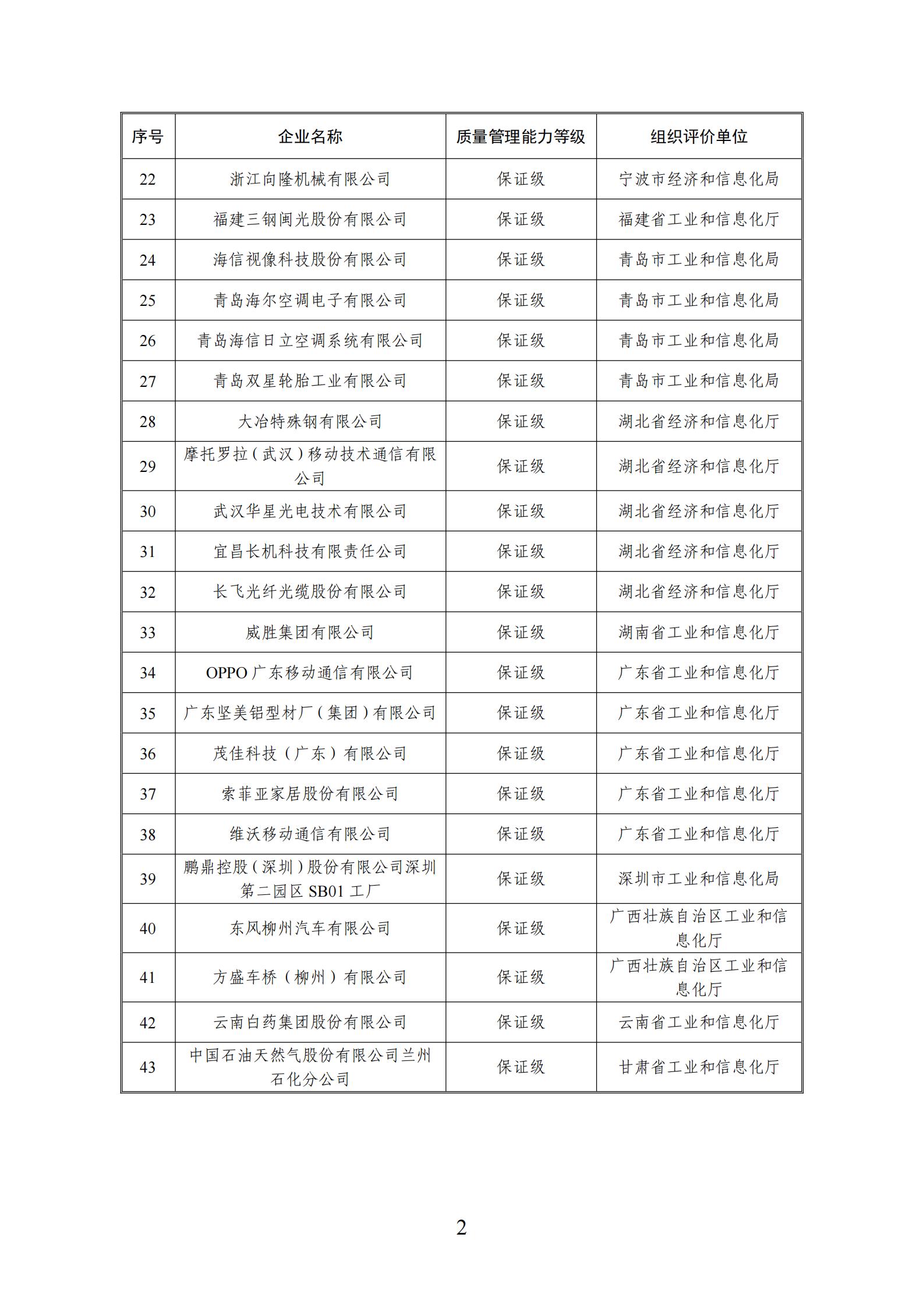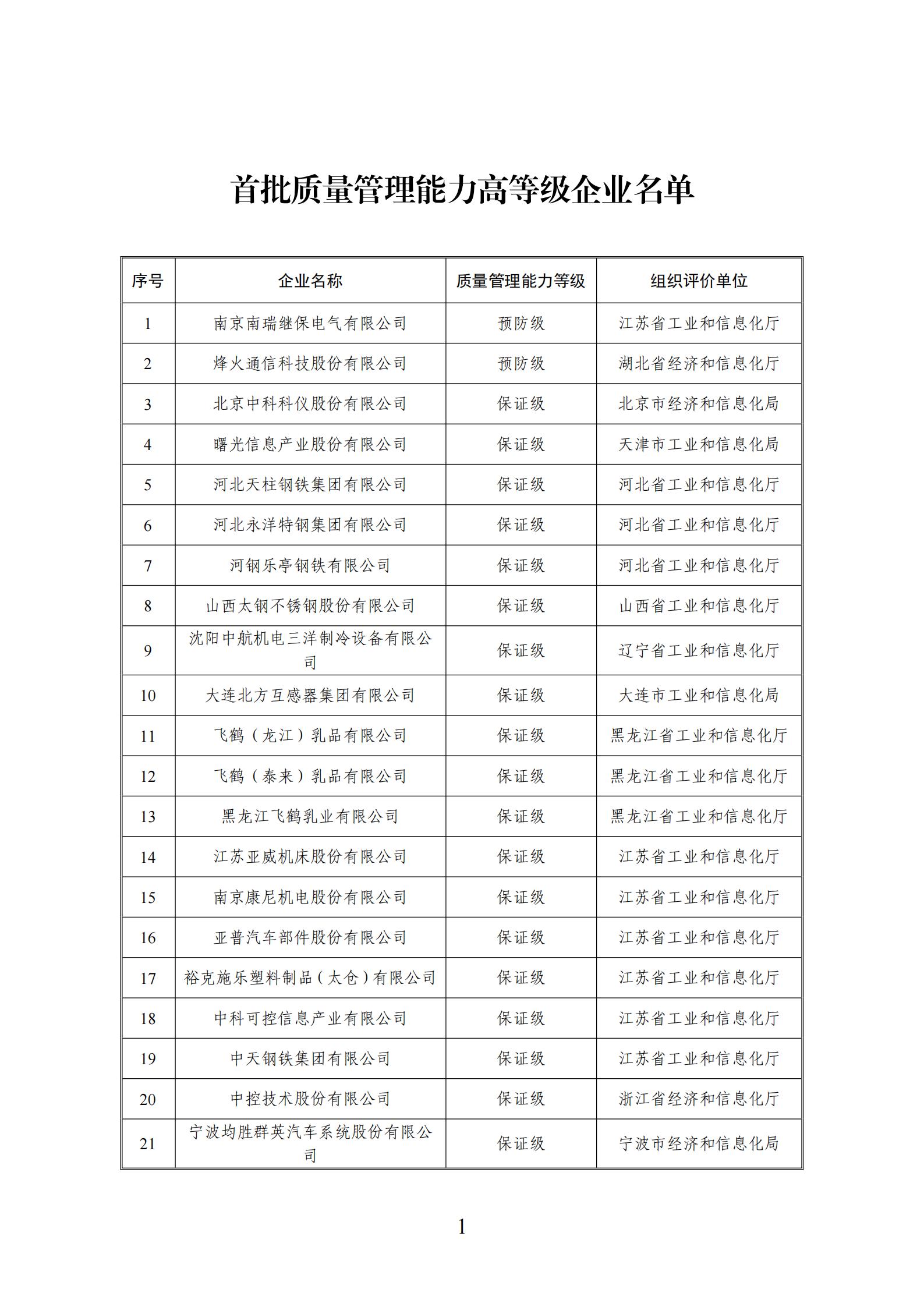 為落實《制造業卓越質量工程實施意見》(工信部聯科〔2023〕249號)和《工業和信息化部辦公廳關于開展2024年制造業企業質量管理能力評價工作的通知》(工信廳科函〔2024〕160號),經自評價、評價復核、二次復核、征求意見、社會公示,我部確定了首批43家質量管理能力高等級企業名單,現予以公布。