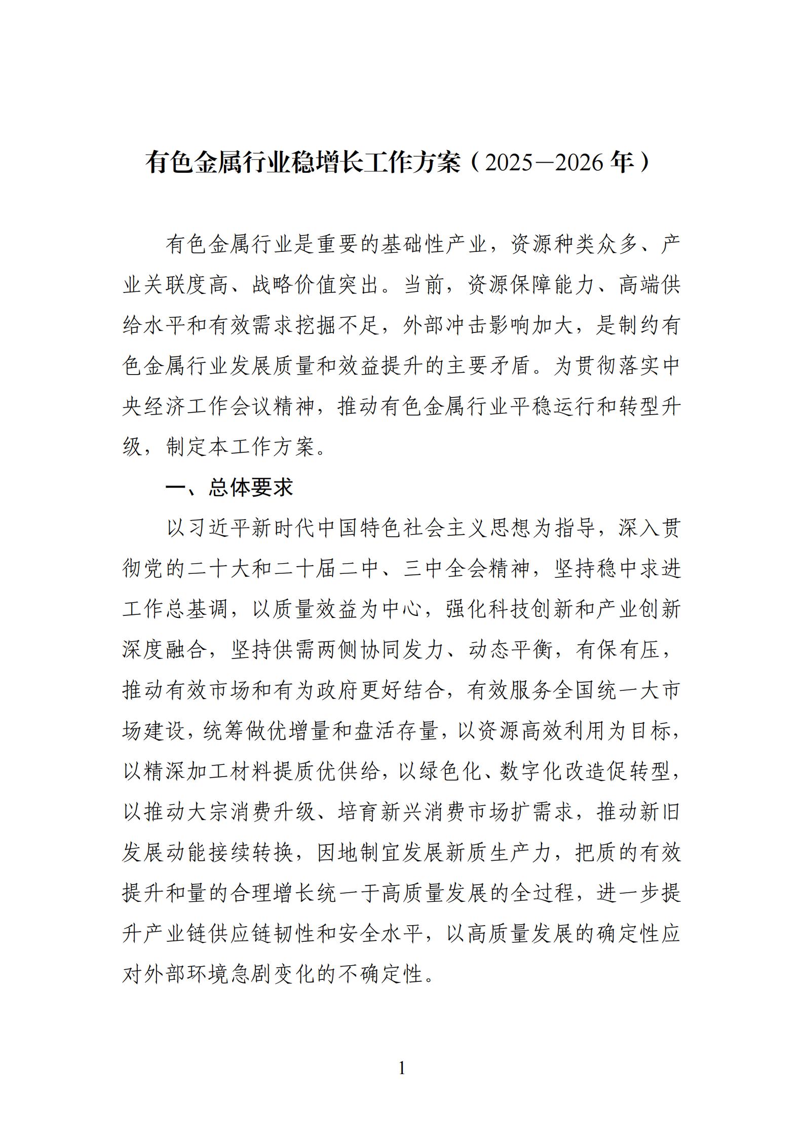 工業(yè)和信息化部等八部門關(guān)于印發(fā)《有色金屬行業(yè)穩(wěn)增長(zhǎng)工作方案(2025—2026年)》的通知
