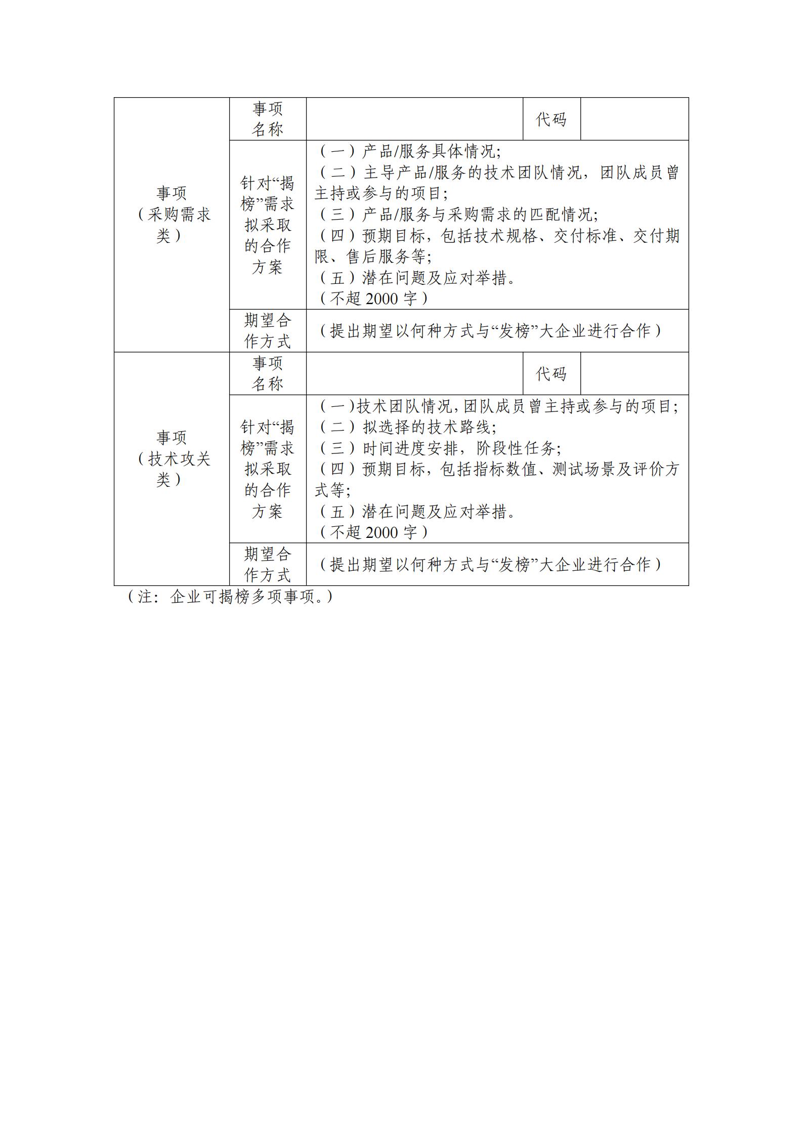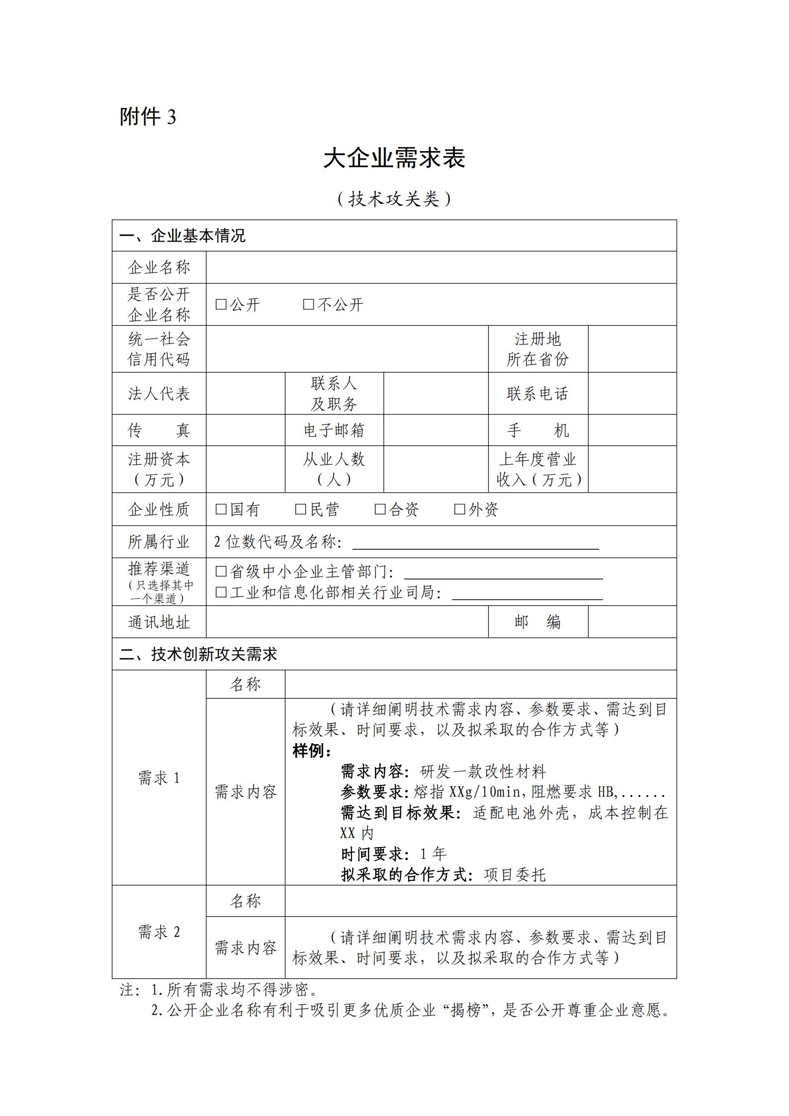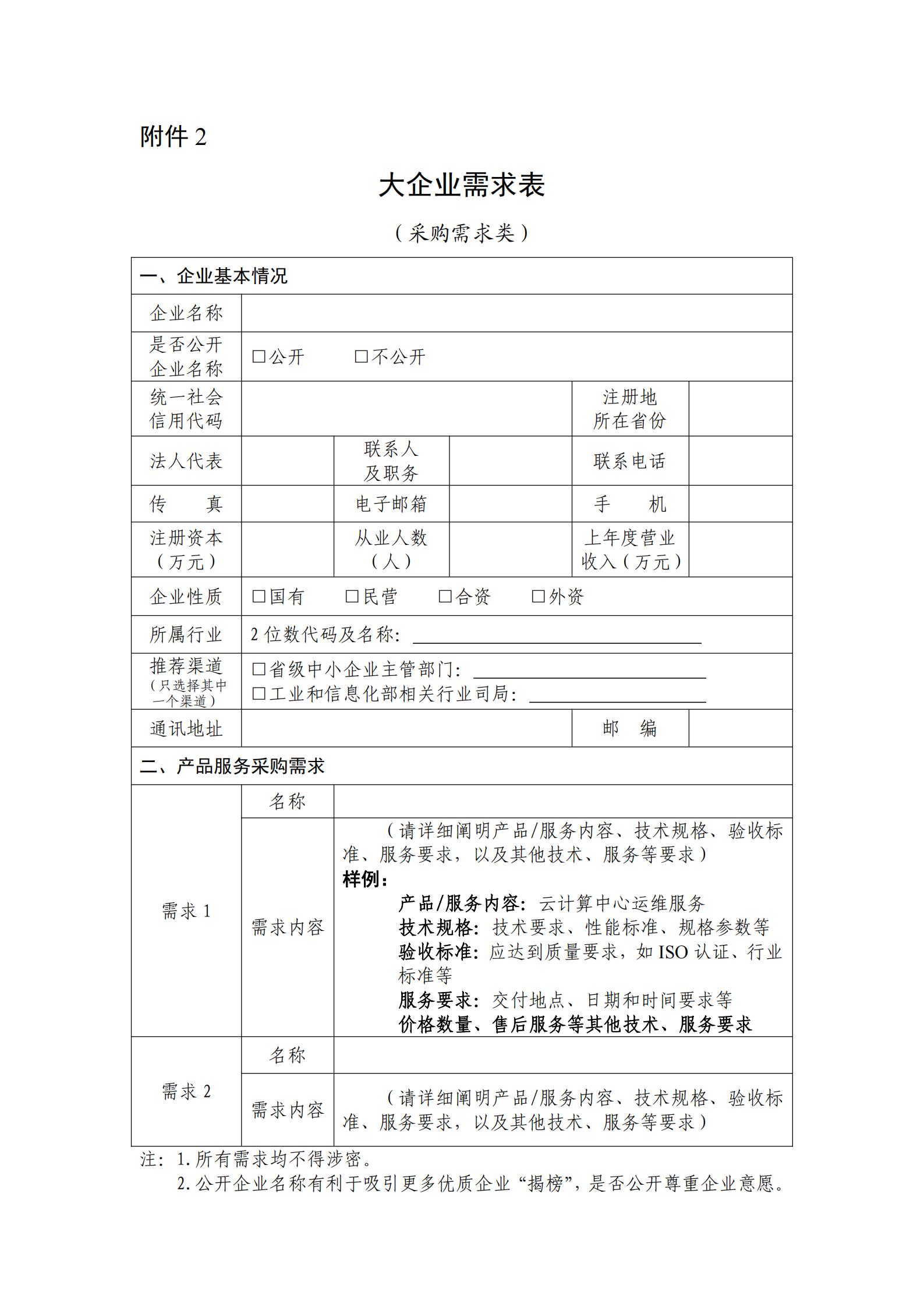 (一)征集大企業需求。各省、自治區、直轄市及計劃單列市、新疆生產建設兵團中小企業主管部門(以下統稱省級中小企業主管部門)、工業和信息化部相關司局組織動員本地區、本行業有一定帶動作用的大企業,結合自身發展實際,重點圍繞三方面“發榜”:一是能夠為中小企業新技術、新產品提供應用場景驗證機會;二是對中小企業產品服務有采購需求,為中小企業融入供應鏈創新鏈提供機會;三是愿同中小企業開展聯合技術創新攻關。有“發榜”意愿的大企業,可于每季度首月15日前在優質中小企業梯度培育平臺(以下簡稱平臺)(https://zjtx.miit.gov.cn/)中供需對接——大企業“發榜”中小企業“揭榜”模塊,根據“發榜”類型填寫《大企業需求表》(附件1、2、3,可選擇是否公開企業名稱)。平臺將結合需求可行性等情況,篩選形成大企業需求目錄,并于每季度首月20日前向社會公開發布。