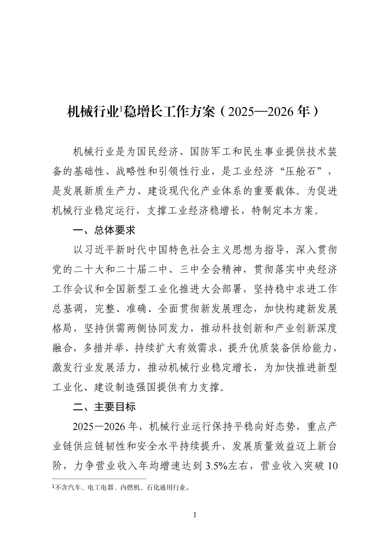 工業和信息化部等六部門關于印發《機械行業穩增長工作方案(2025—2026年)》的通知