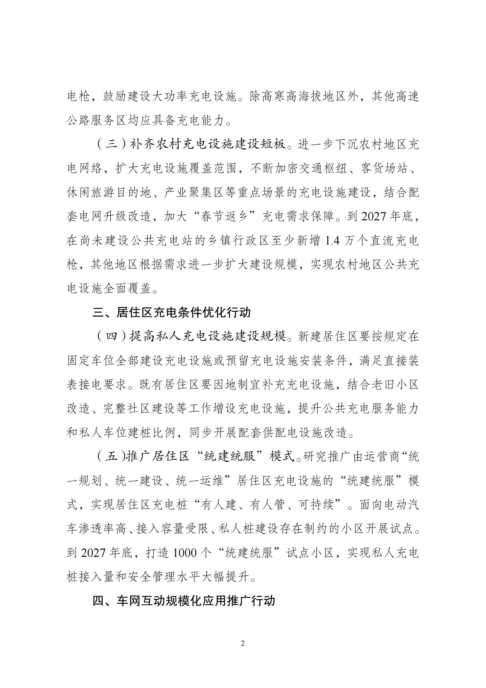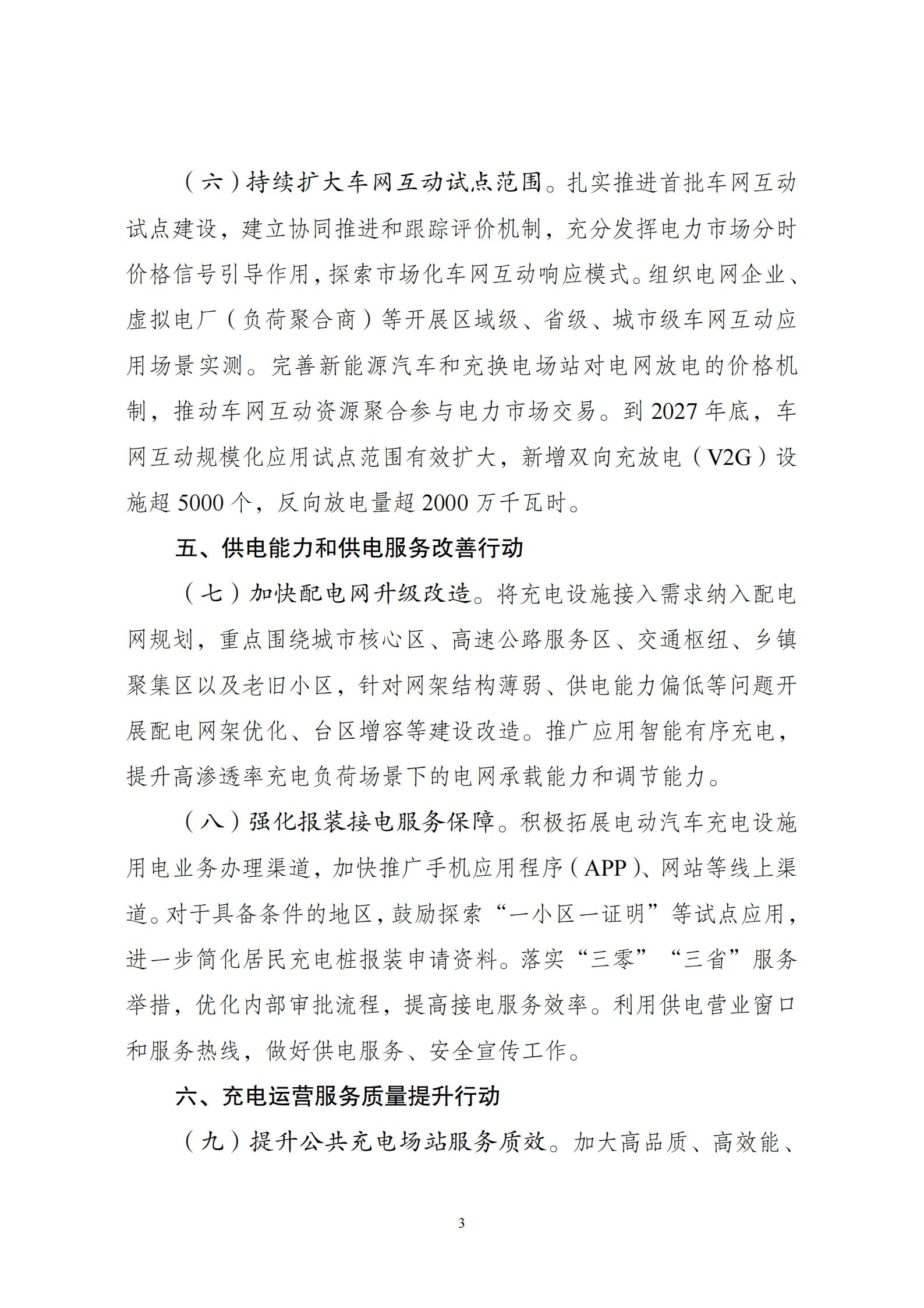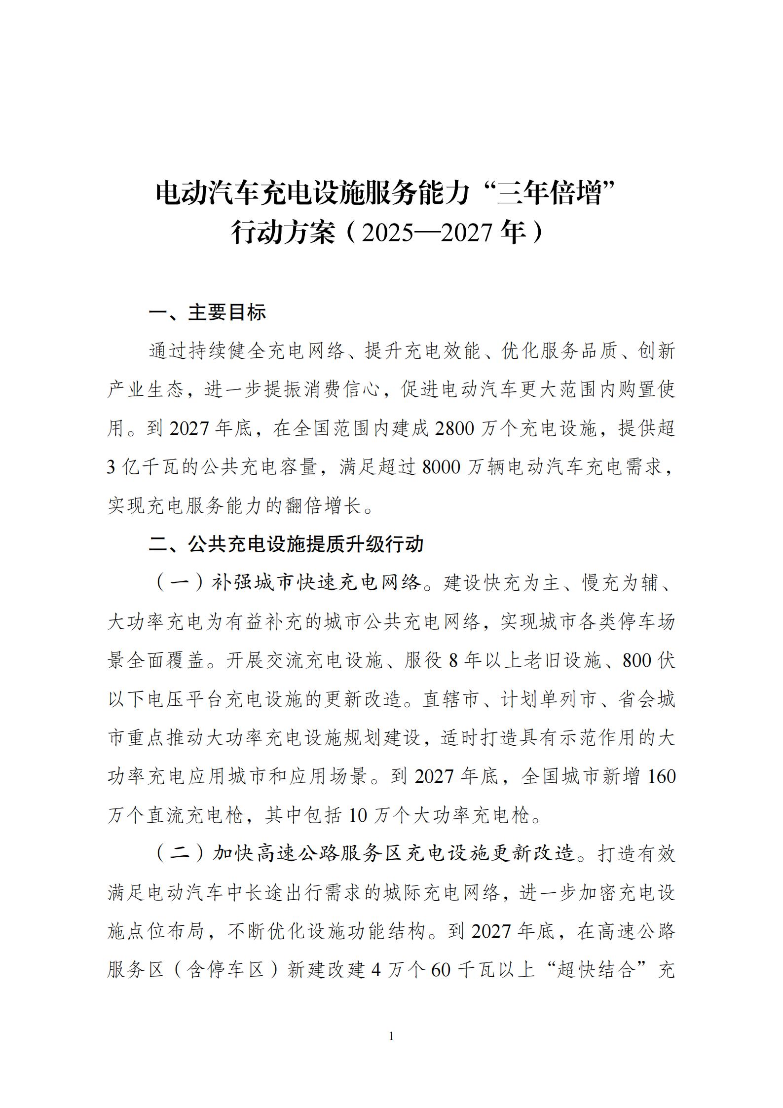 ??為落實《提振消費專項行動方案》有關要求,加大力度完善電動汽車充電設施服務網(wǎng)絡,提升消費品質(zhì),促進電動汽車更大范圍內(nèi)購置使用,國家發(fā)展改革委等部門研究制定了《電動汽車充電設施服務能力“三年倍增”行動方案(2025—2027年)》,現(xiàn)印發(fā)給你們,請認真組織落實。