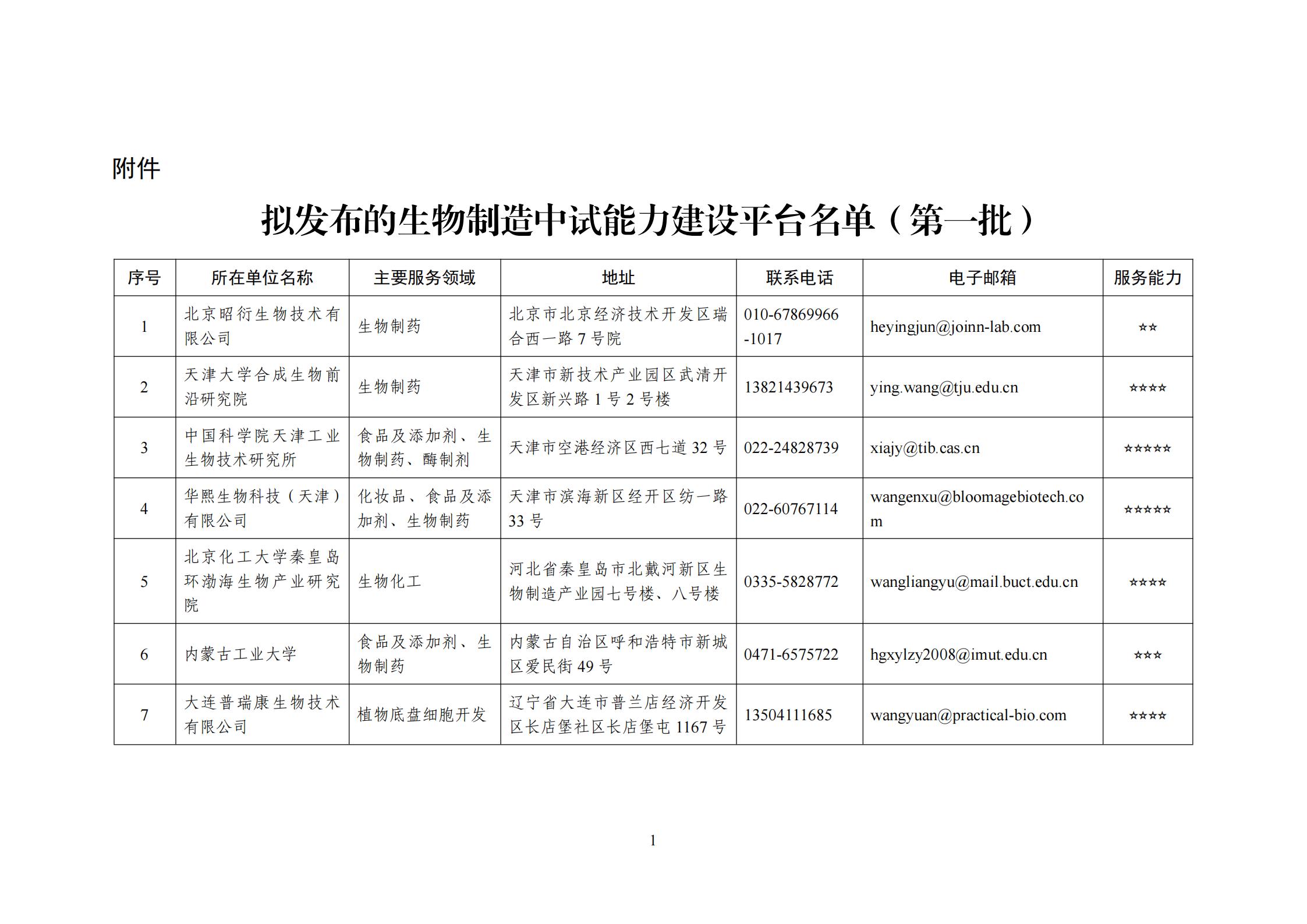 附件:擬發布的生物制造中試能力建設平臺名單(第一批)