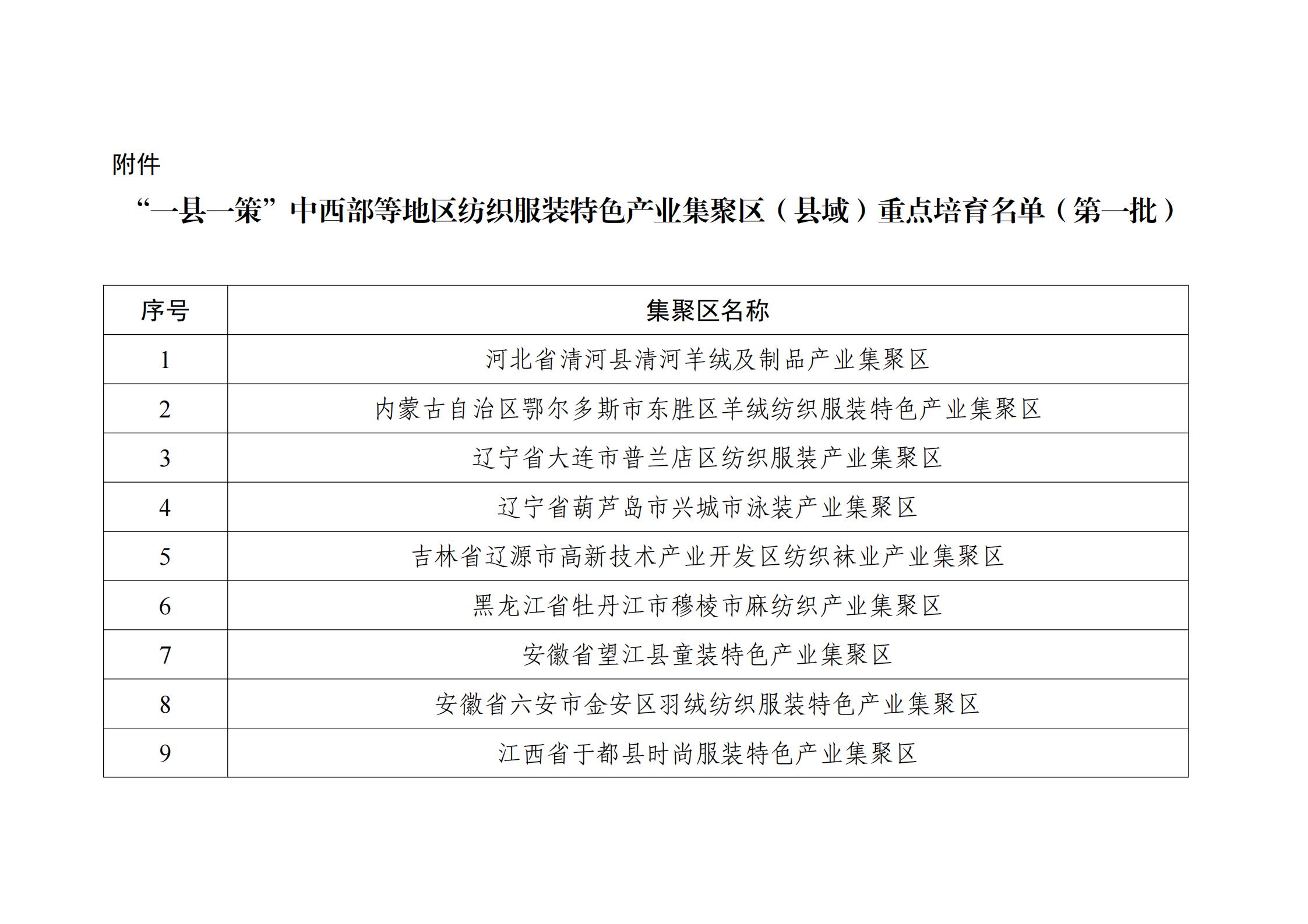 工業和信息化部關于公布《“一縣一策”中西部等地區紡織服裝特色產業集聚區(縣域)重點培育名單(第一批)》的通告