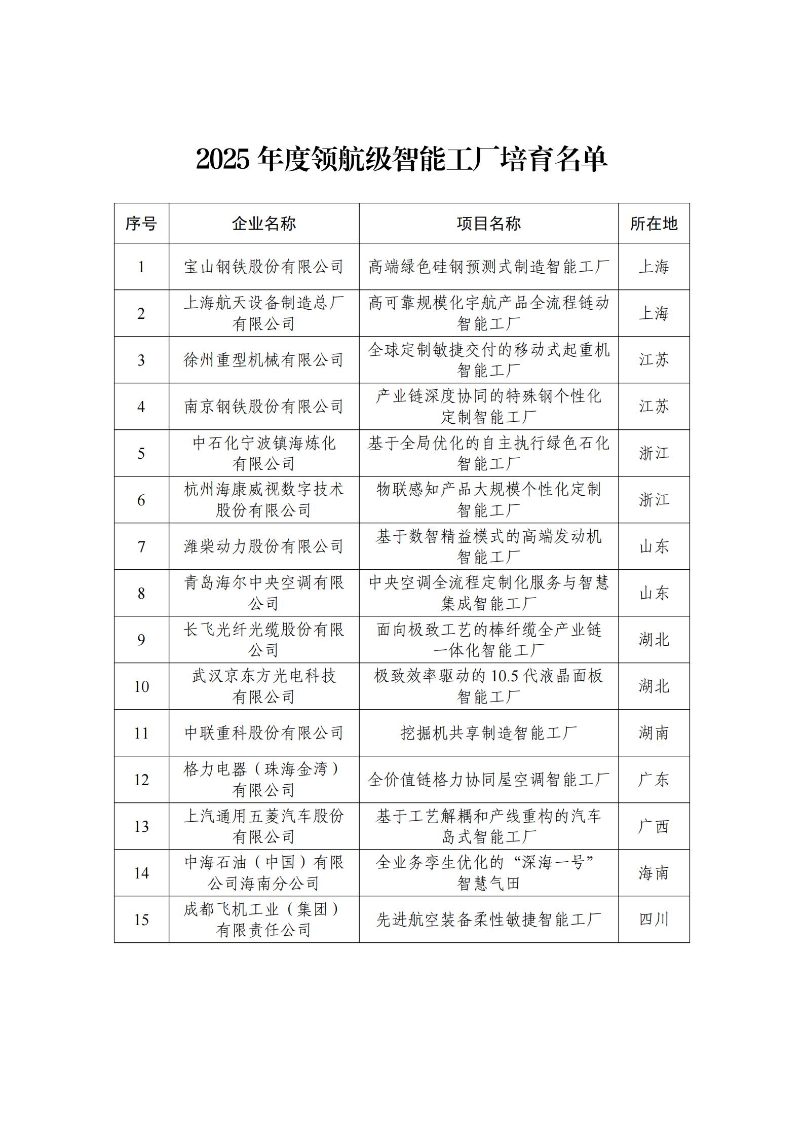 ? ? ? ?為貫徹落實《制造業數字化轉型行動方案》,按照《“十四五”智能制造發展規劃》任務部署,打造智能制造“升級版”,經省級有關部門推薦、專家評審、現場核查、網上公示等程序,現將2025年度領航級智能工廠培育名單印發給你們,請加強指導和服務,鼓勵給予相應政策支持。