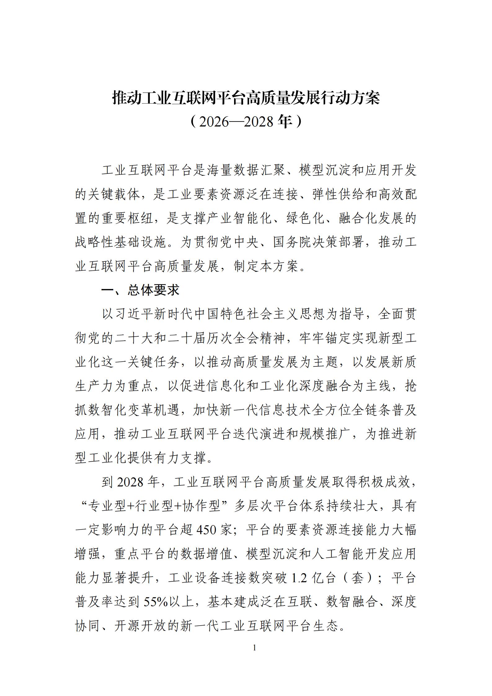 為深入貫徹黨中央、國務院有關決策部署,加快工業互聯網創新發展,工業和信息化部組織編制了《推動工業互聯網平臺高質量發展行動方案(2026—2028年)》。現印發給你們,請結合實際抓好落實。