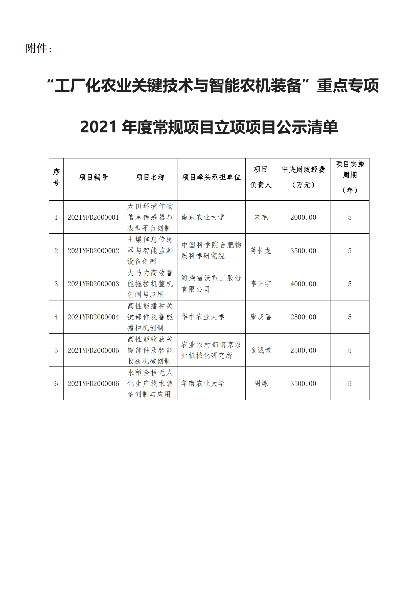 ? ? ? “工廠化農(nóng)業(yè)關(guān)鍵技術(shù)與智能農(nóng)機裝備”重點專項2021年度常規(guī)項目立項項目公示清單.pdf