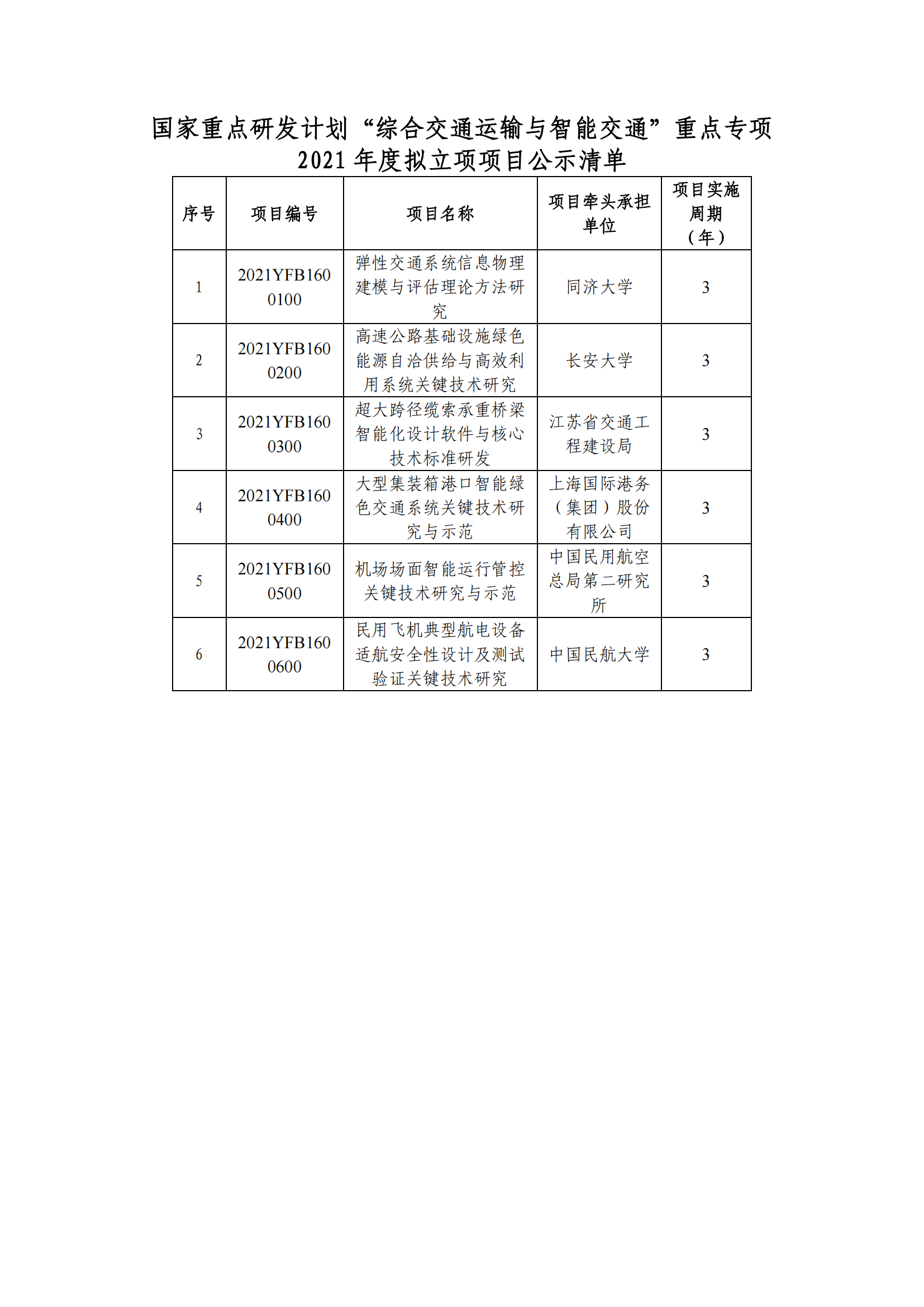 關(guān)于國家重點研發(fā)計劃“綜合交通運輸與智能交通”重點專項2021年度項目安排公示的通知