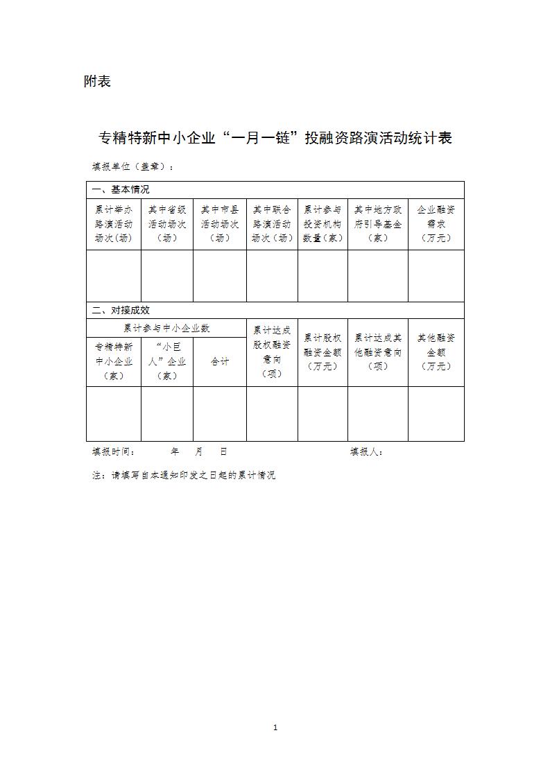 (四)務求取得實效。定期對參加路演活動的企業進行融資情況回訪,及時了解企業后續需求及需要協調解決的問題,加強活動成效總結和經驗做法分析,不斷優化活動組織方式,推動路演活動走深走實。各地工業和信息化主管部門牽頭,會同有關區域性股權市場做好活動信息報送工作,于每季度結束后5個工作日內,將專精特新中小企業“一月一鏈”投融資路演活動統計表(見附表)報送至郵箱gxbrongzi@163.com,在重要活動舉辦后及時報送活動信息和成效。工業和信息化部與中國證監會加強活動信息共享。