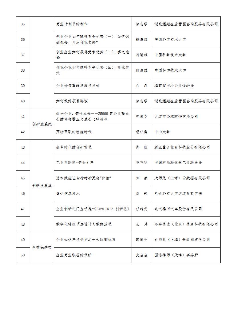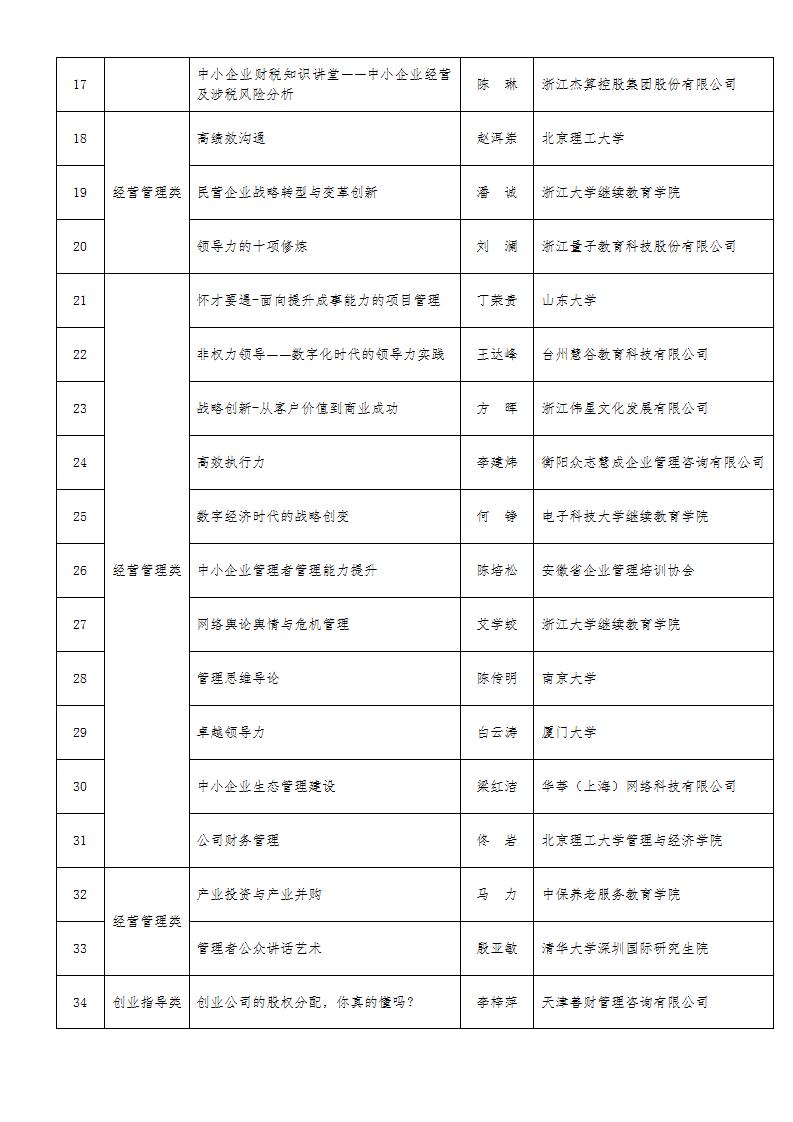 ? ? ? ? 為擴大中小企業人才培訓公共服務供給,助力中小企業提升生產經營管理水平,我部組織開展首次中小企業人才培訓“名師優課”征集遴選活動。經公開征集、各地中小企業主管部門初選、專家評審、企業家評價、公眾投票評價等程序,確定了50門優質課程,現予發布。有關事項通知如下。