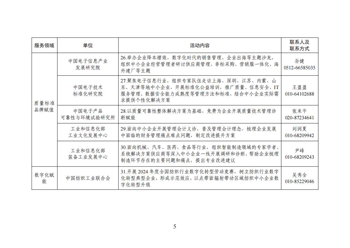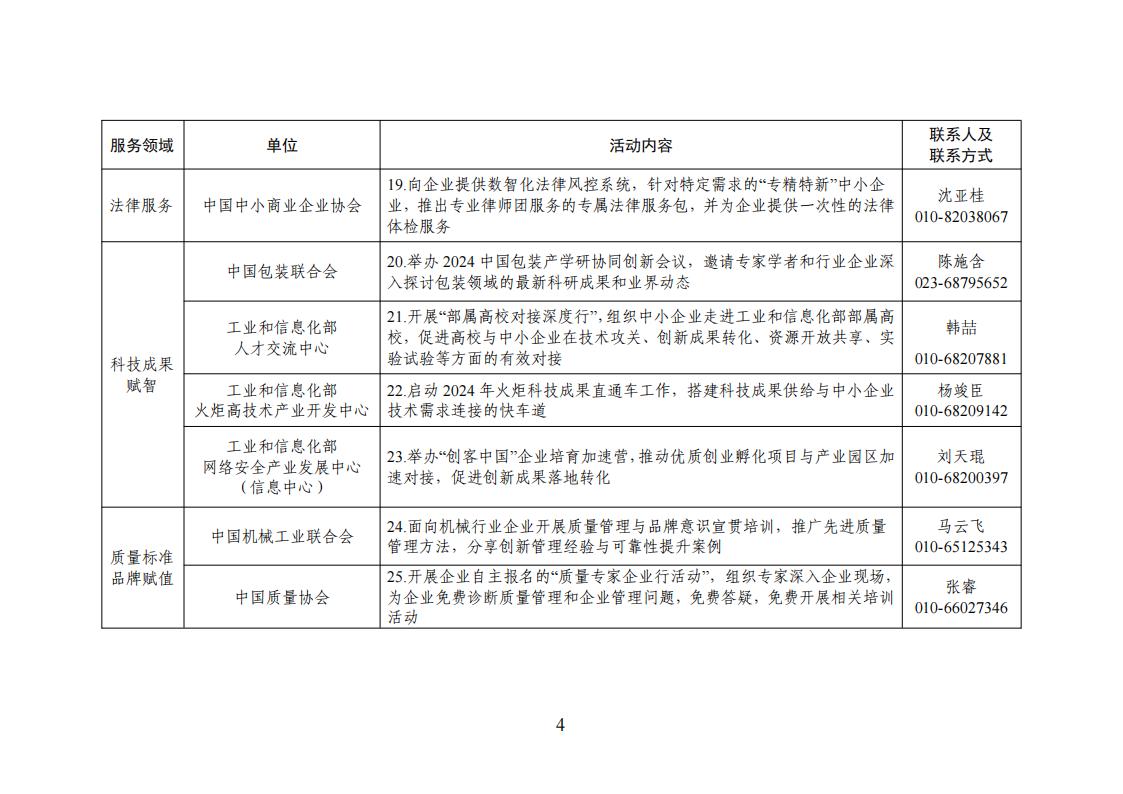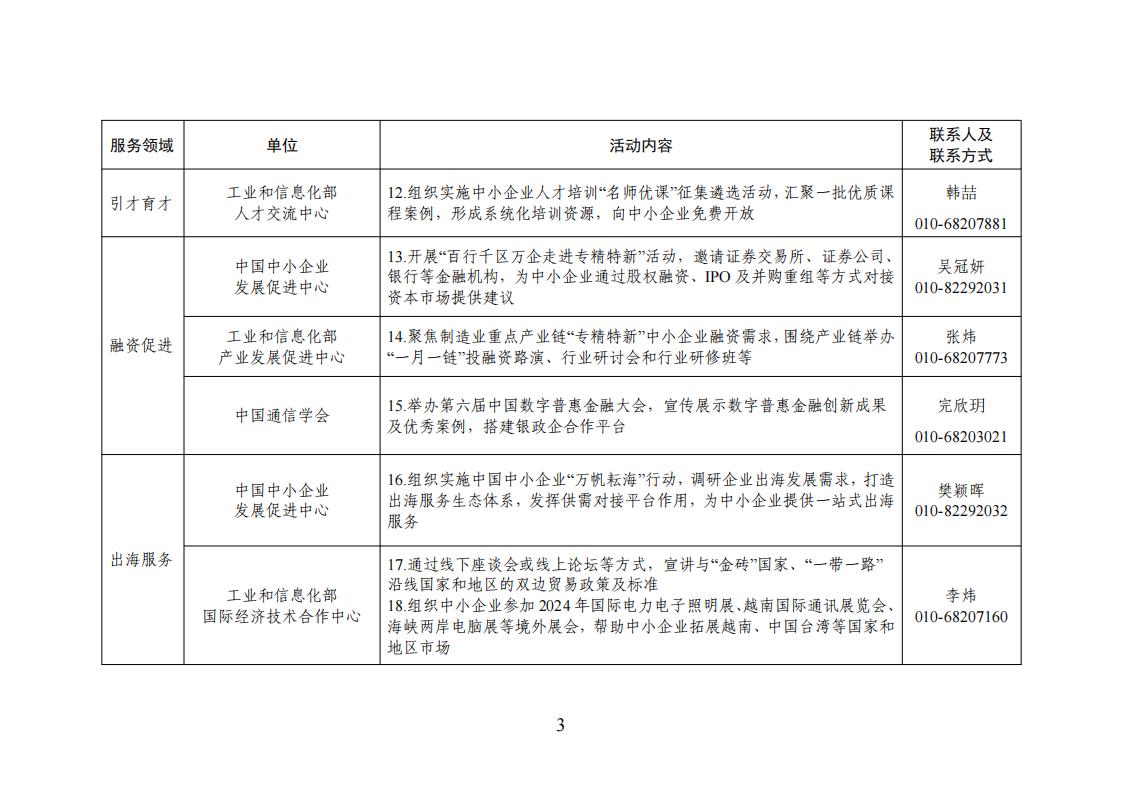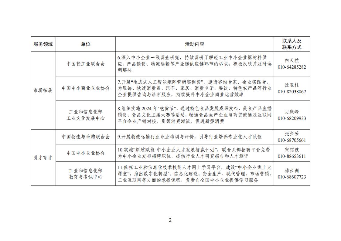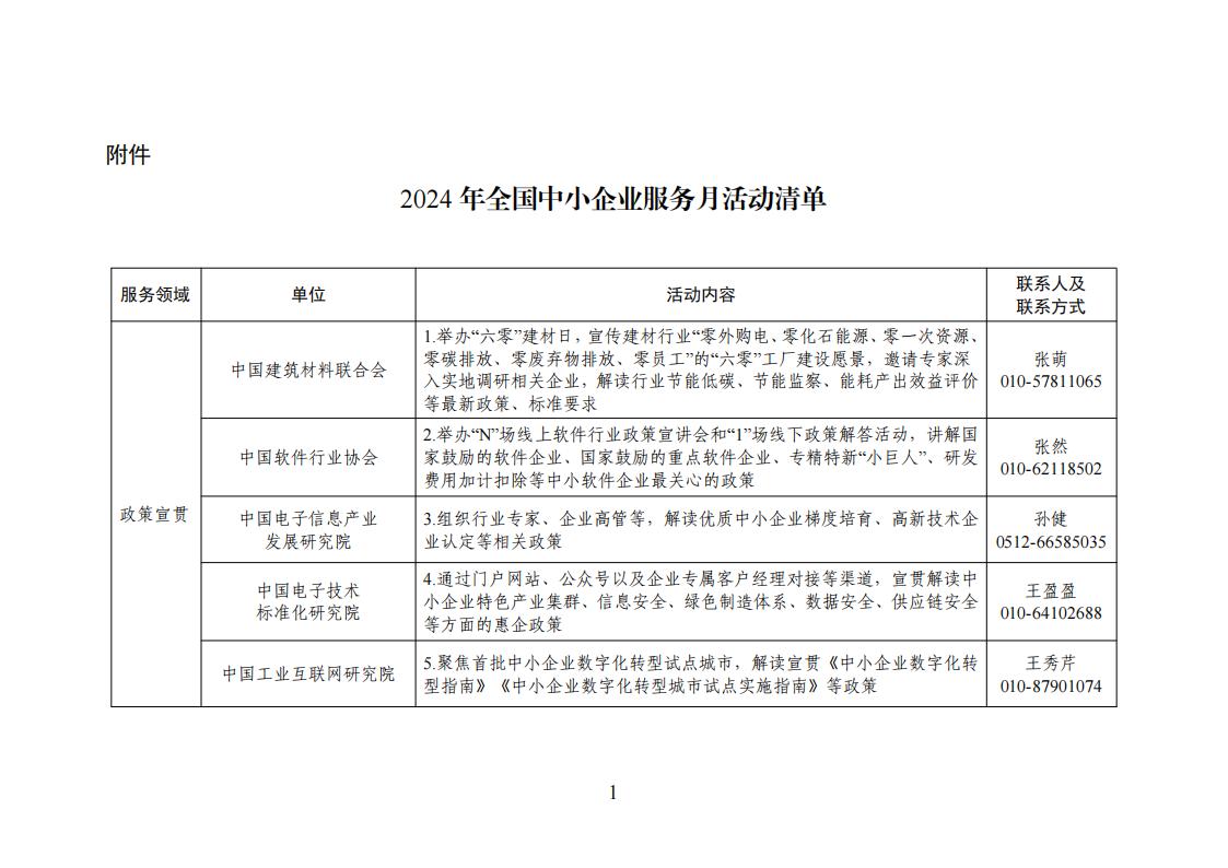 根據2024年“一起益企”中小微企業服務行動要求,有關行業協會、工業和信息化部所屬單位按照《2024年全國中小企業服務月活動清單》(見附件),從政策宣貫、市場拓展、引才育才、融資促進、出海服務、法律服務、科技成果賦智、質量標準品牌賦值、數字化賦能等9個方面開展服務活動。