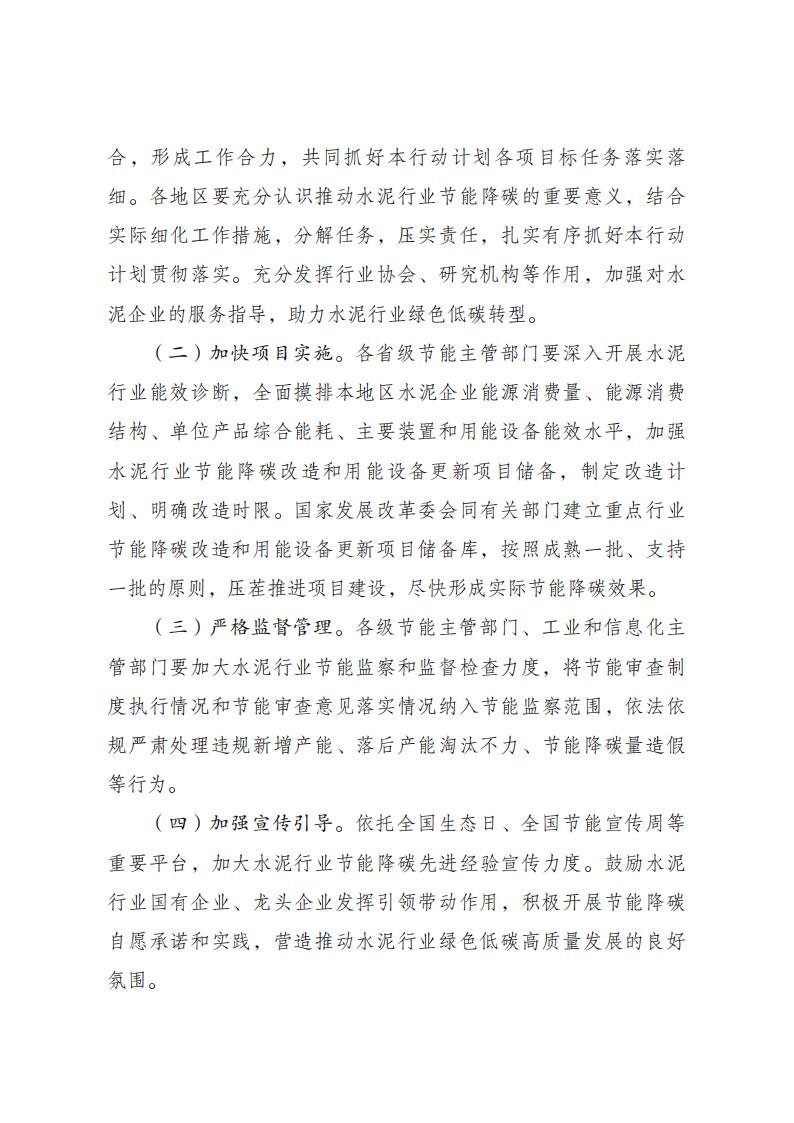 ??為全面貫徹黨的二十大精神,認真落實黨中央、國務院決策部署,實施全面節(jié)約戰(zhàn)略,加大節(jié)能降碳工作力度,深入推進水泥行業(yè)節(jié)能降碳改造和用能設備更新,支撐完成“十四五”能耗強度降低約束性指標,國家發(fā)展改革委、工業(yè)和信息化部、生態(tài)環(huán)境部、市場監(jiān)管總局、國家能源局等部門制定了《水泥行業(yè)節(jié)能降碳專項行動計劃》。現(xiàn)印發(fā)給你們,請認真抓好落實。