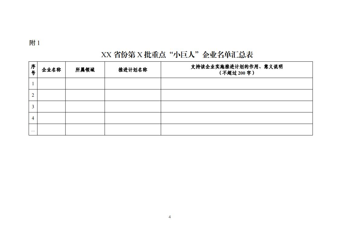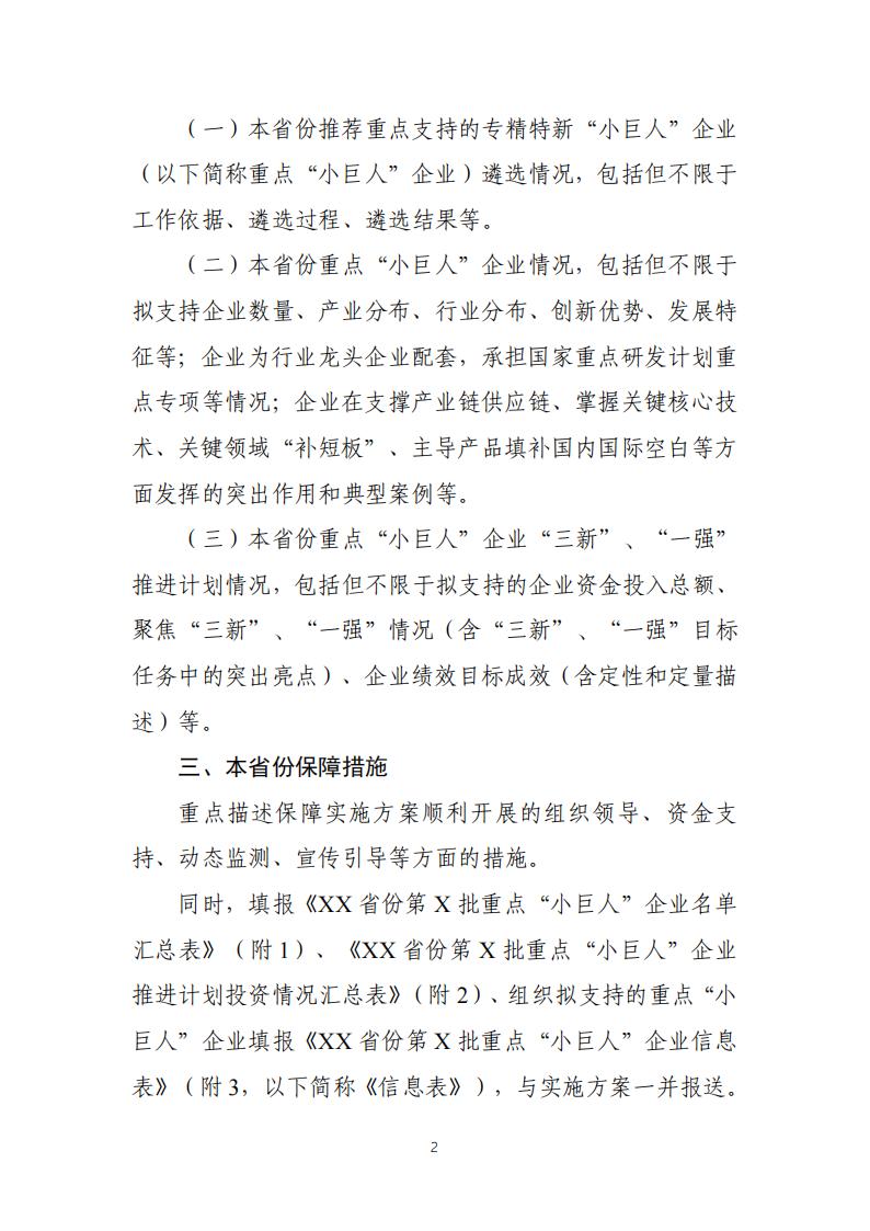 請各省級中小企業(yè)主管部門會(huì)同財(cái)政部門,按要求遴選推薦符合條件的“小巨人”企業(yè),編制《XX省份第X批支持專精特新“小巨人”企業(yè)工作實(shí)施方案》,于7月31日前,將《實(shí)施方案》按程序聯(lián)合上報(bào)兩部門(加蓋公章紙質(zhì)版和掃描PDF電子版各一式兩份)。