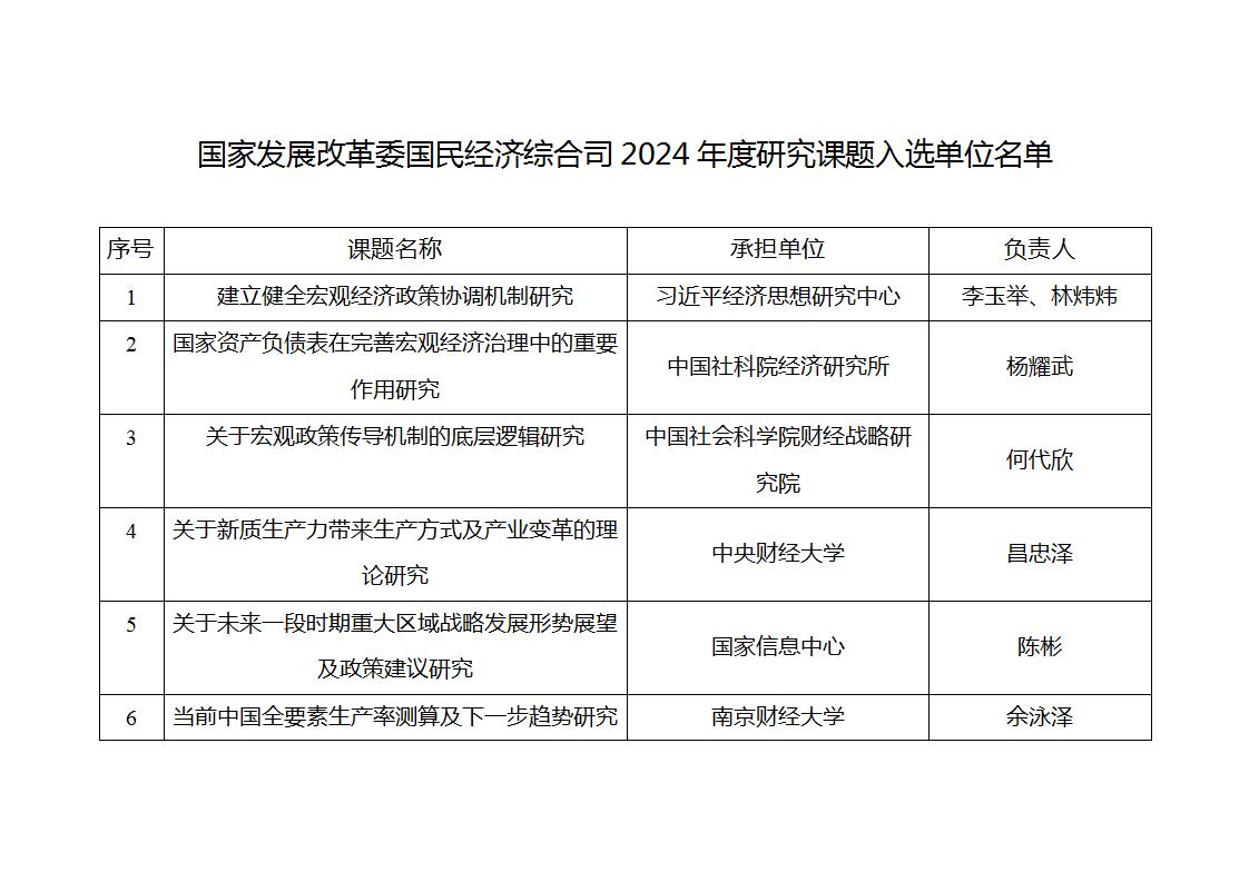 國家發改委國民經濟綜合司關于2024年度研究課題入選單位的公告