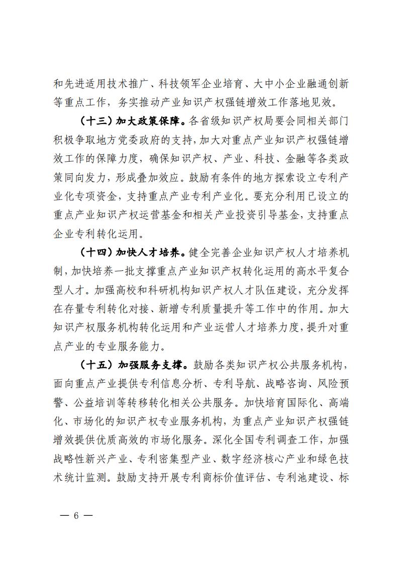 國家知識產權局聯合教育部、科技部、工業和信息化部、國務院國資委、市場監管總局、金融監管總局、中國科學院、中國貿促會制定了《關于推進重點產業知識產權強鏈增效的若干措施》,現印發給你們,請認真貫徹落實。