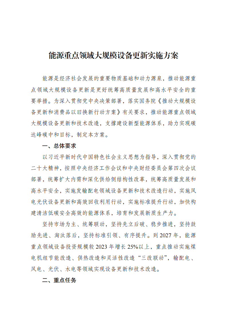 ??為貫徹落實國務院《推動大規模設備更新和消費品以舊換新行動方案》(國發〔2024〕7號),推動能源重點領域大規模設備更新和技術改造,國家發展改革委、國家能源局組織編制了《能源重點領域大規模設備更新實施方案》。現印發給你們,請認真組織實施。