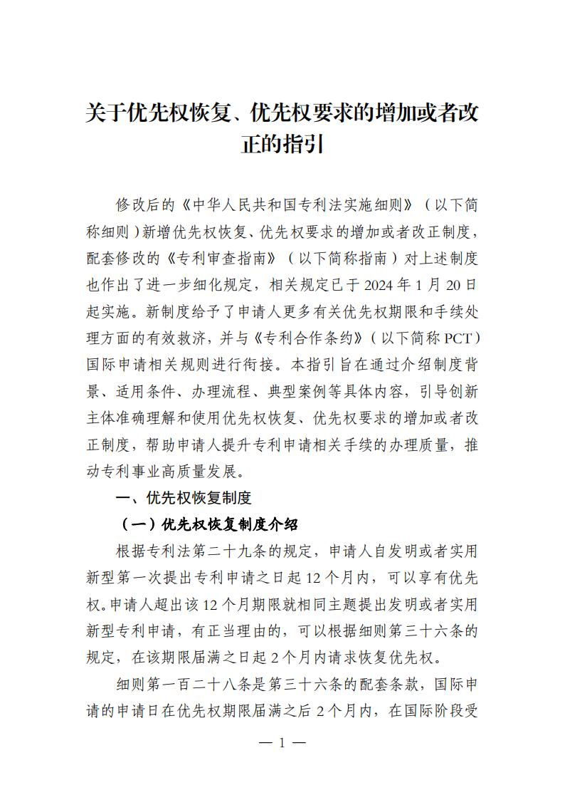 國家知識產權局|關于優先權恢復、優先權要求的增加或者改正的指引