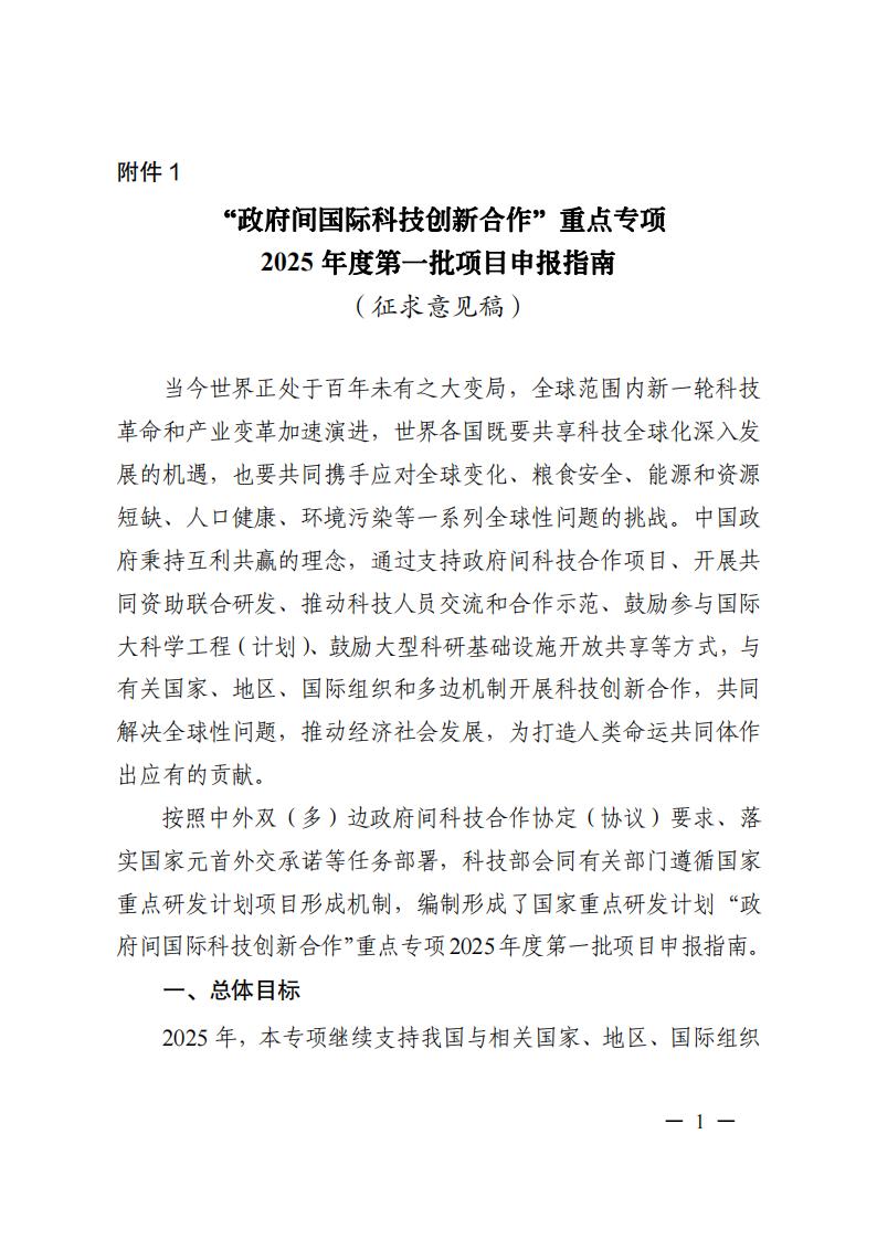 關于對國家重點研發計劃“政府間國際科技創新合作”等2個重點專項2025年度有關批次項目申報指南征求意見的通知