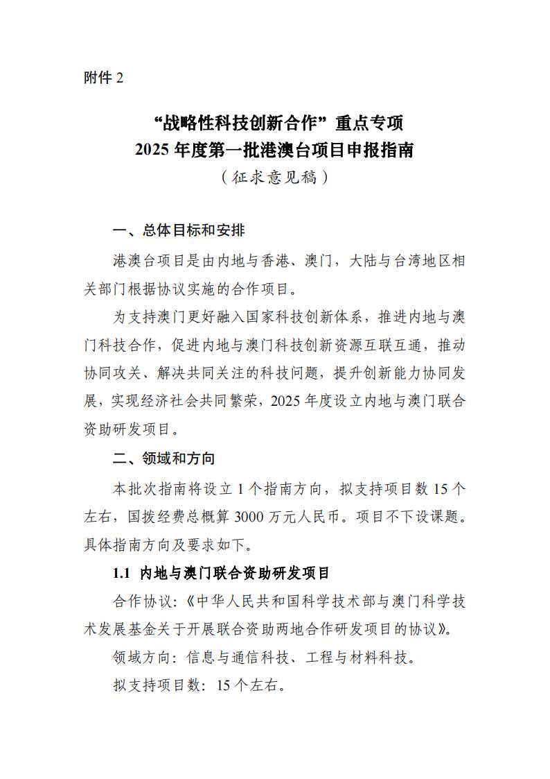 ? ? ?現將國家重點研發計劃“政府間國際科技創新合作”重點專項和“戰略性科技創新合作”重點專項2025年度有關批次項目申報指南(見附件)向社會征求意見。征求意見時間為2024年9月27日至2024年10月9日,請于10月9日24點之前發送至電子郵箱:liuh@most.cn。
