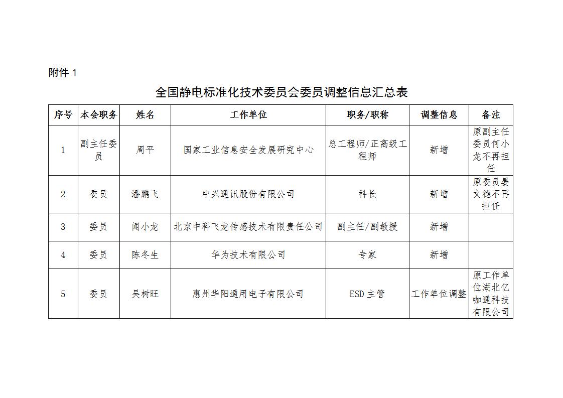 全國靜電標準化技術委員會等2個標準化技術委員會委員調整公示
