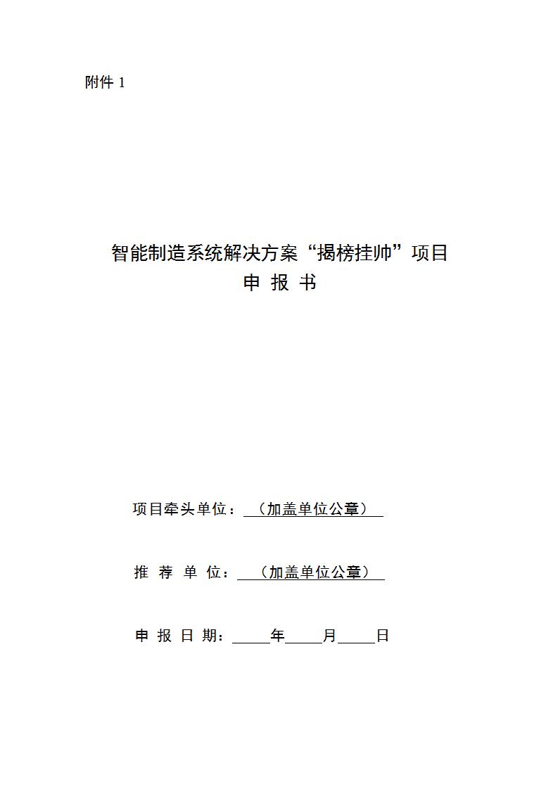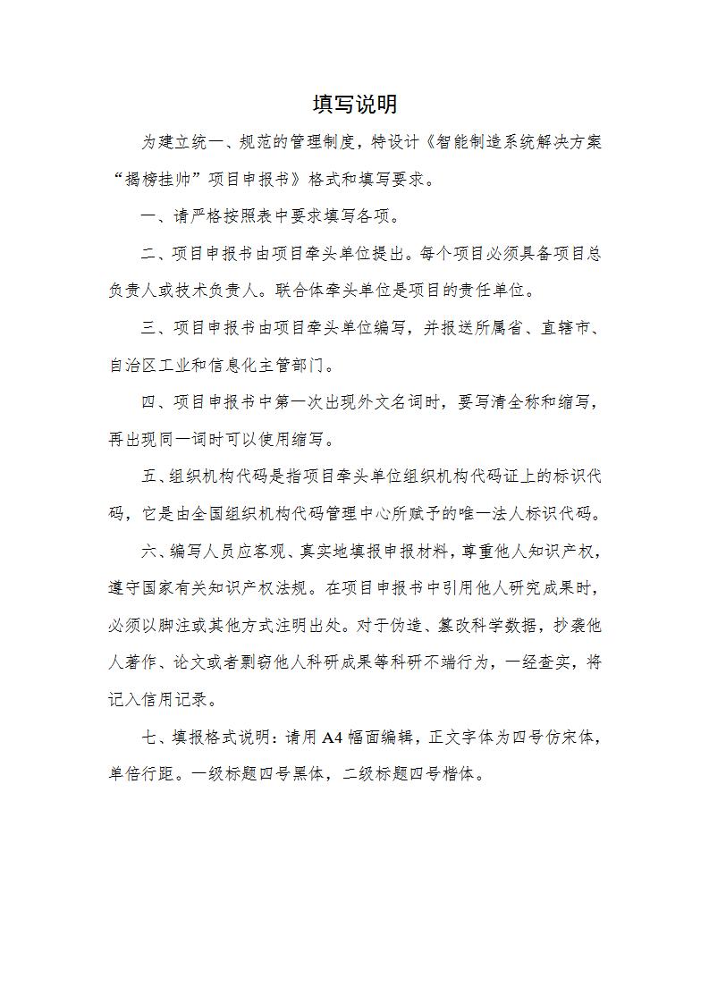 (一)申報單位可結合自身實際編制《智能制造系統解決方案“揭榜掛帥”項目申報書》(附件1),明確智能制造系統解決方案產品和服務揭榜任務,于2024年11月13日前完成線上申報。申報單位應對申報內容的真實性負責,確保申報材料不涉及國家秘密、商業秘密。