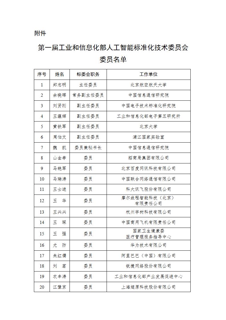 工信部|第一屆工業和信息化部人工智能標準化技術委員會委員名單公布