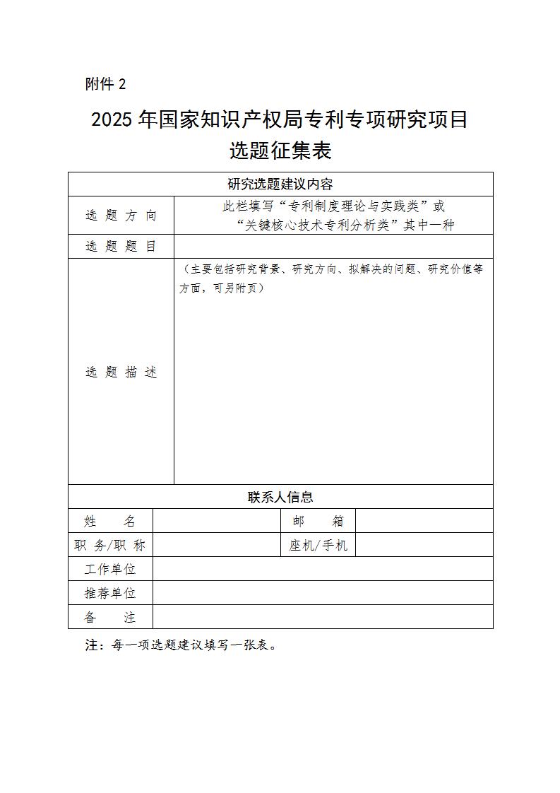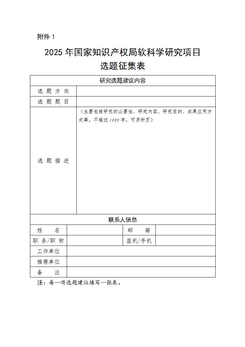 為做好2025年度國家知識產權局課題研究項目(軟科學研究項目、專利專項研究項目)申報工作,更好反映研究重點和研究需求,科學編制研究指南,現請你單位聚焦習近平總書記關于知識產權工作的重要指示論述和黨中央、國務院有關決策部署中的重大理論和實踐問題,廣泛征集所屬領域、地區研究機構和專家學者的意見建議,做好匯總整理、審核把關和篩選推薦,于2024年12月25日前將選題征集表(電子件)反饋至相關項目聯系人。請針對軟科學研究項目和專利專項研究項目分別提供選題建議,每個單位每類項目推薦數量不超過3個。被采納并列入研究指南的選題將公開招標、公平競爭。