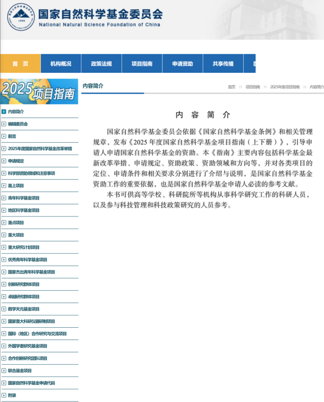 ? ? ?完整指南目錄內容詳見: https://www.nsfc.gov.cn/publish/portal0/xmzn/2025/jj/