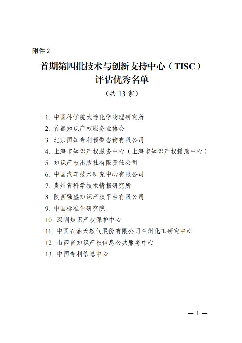 我局與世界知識產權組織啟動在華建設技術與創新支持中心(TISC)以來,首期第四批TISC正式運行已滿三年。根據《中國國家知識產權局和世界知識產權組織關于在華建設技術與創新支持中心諒解備忘錄》和《技術與創新支持中心(TISC)建設實施辦法》,我局與世界知識產權組織共同組織完成對首期第四批TISC的運行評估,同意首都知識產權服務業協會等48家單位作為TISC繼續運行(名單見附件1)。其中,中國科學院大連化學物理研究所等13家單位評估等次為優秀(名單見附件2)。