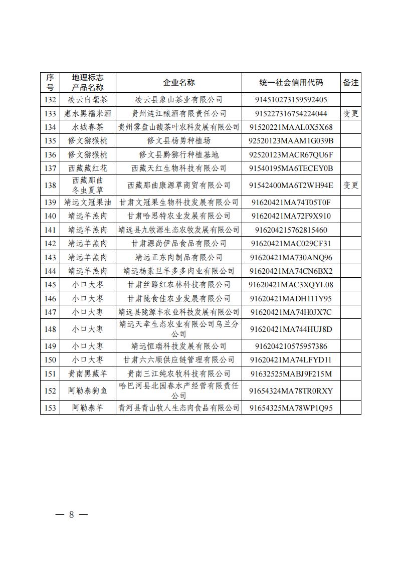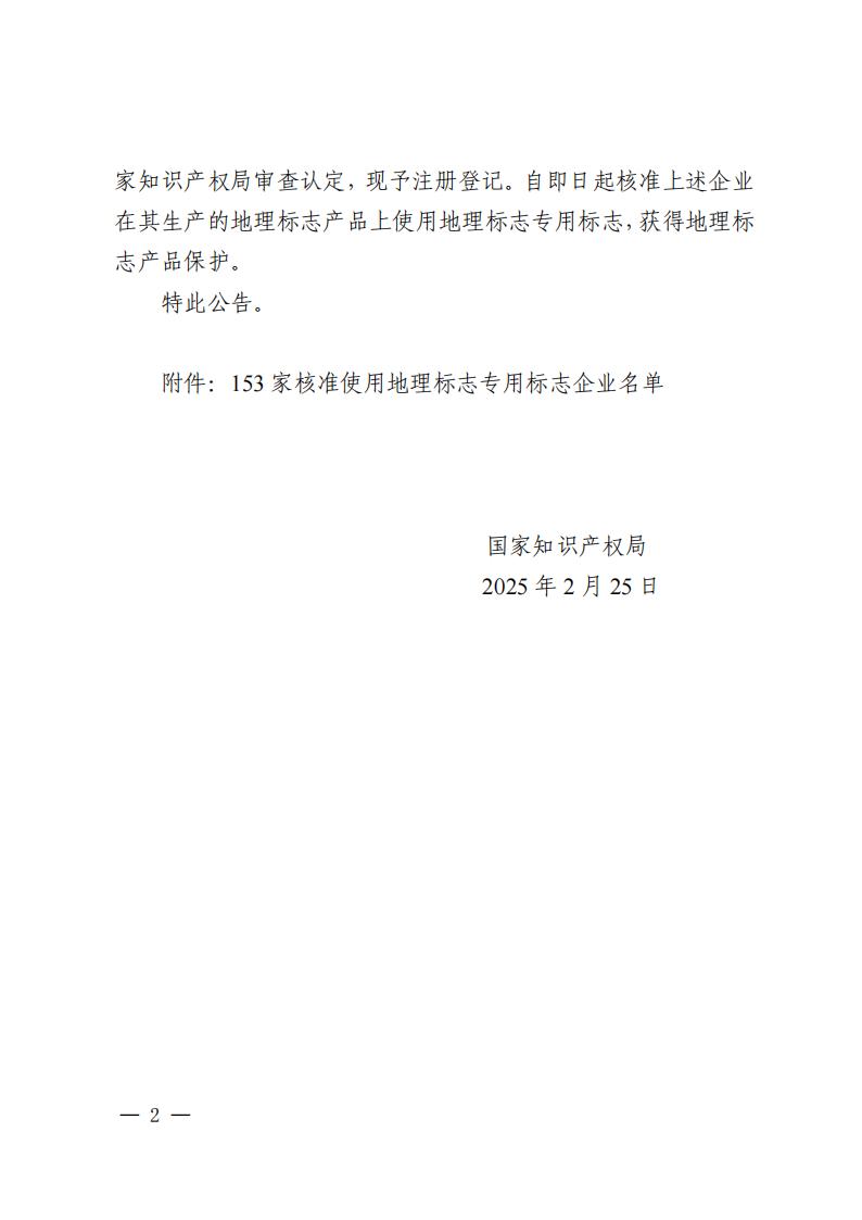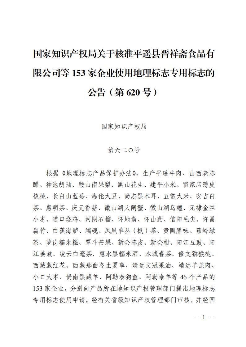 國家知識產權局|關于核準平遙縣晉祥齋食品有限公司等 153 家企業使用地理標志專用標志的公告