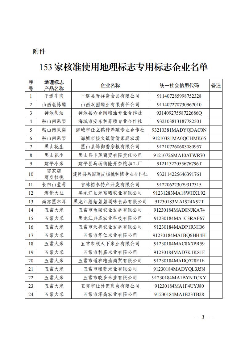 國家知識產權局關于核準平遙縣晉祥齋食品有限公司等 153 家企業使用地理標志專用標志的