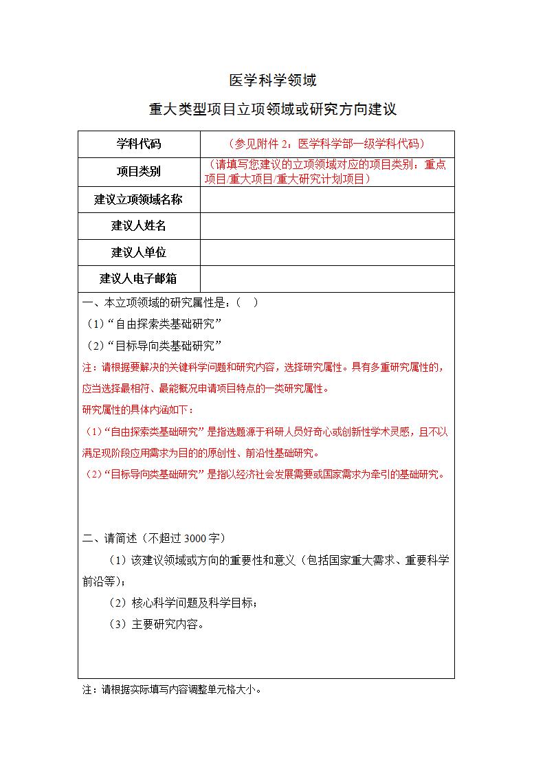 請填寫附件中的“重大類型項目立項領域建議書”,并于2025年4月2日前通過電子郵件發至醫學科學部聯系人。