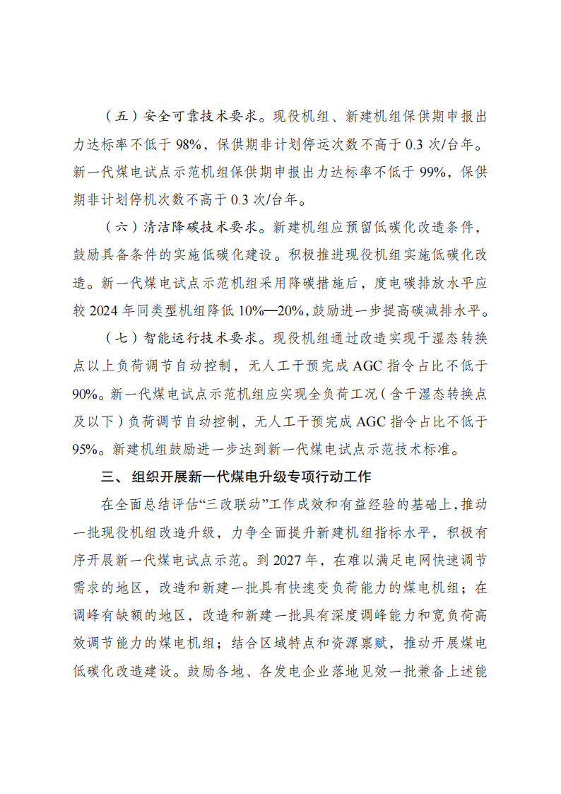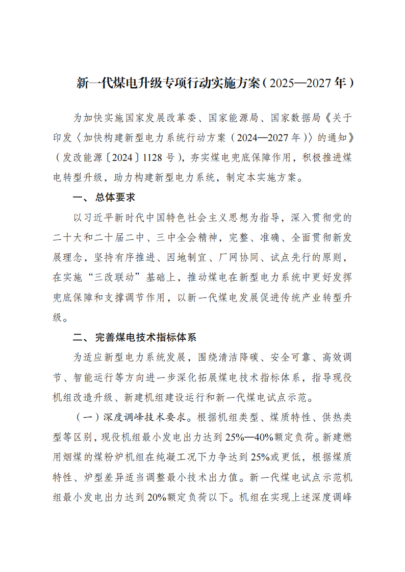 ??為深入貫徹黨中央、國務院有關決策部署,落實《加快構建新型電力系統行動方案(2024—2027年)》有關要求,夯實煤電兜底保障作用,積極推進煤電轉型升級,國家發展改革委、國家能源局制定了《新一代煤電升級專項行動實施方案(2025—2027年)》。現印發給你們,請認真組織落實。