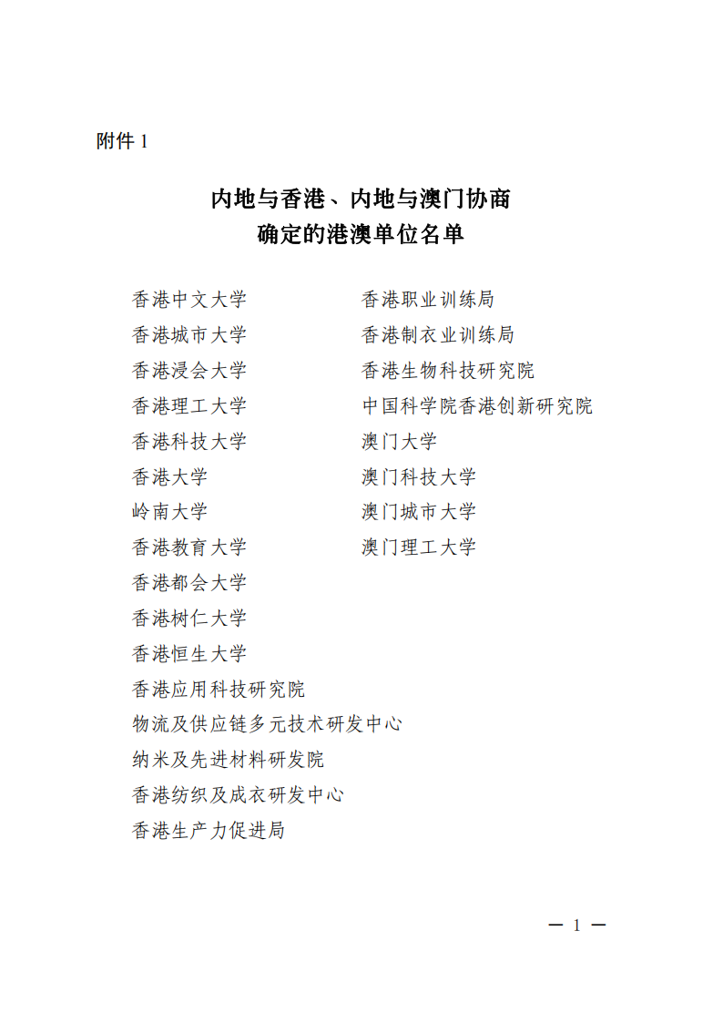 1. 內地與香港、內地與澳門協商確定的港澳單位名單